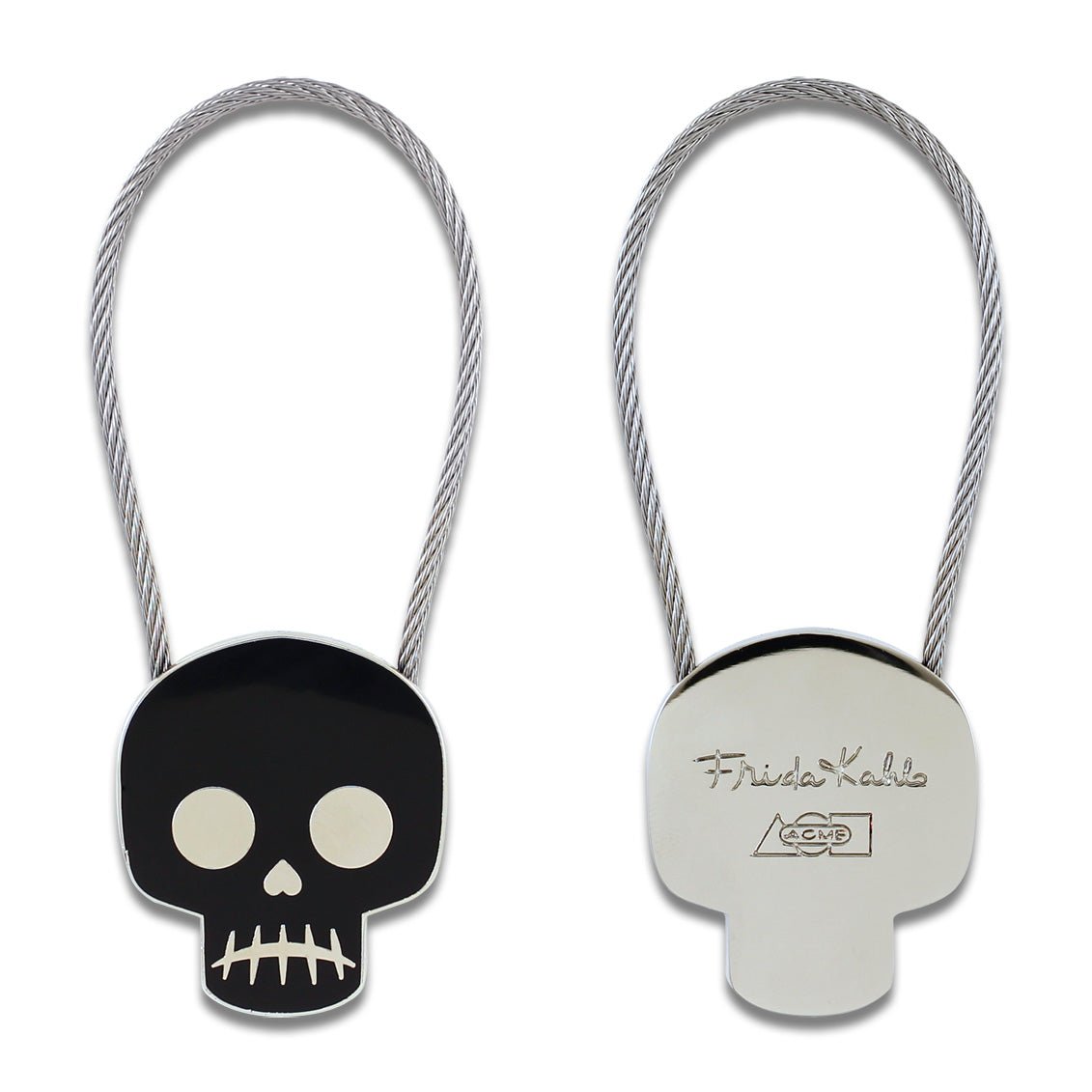 "Skull" Keyring, a design from Frida Kahlo, comes from ACME Studio's line of designer key rings. These key rings are made of a special zinc alloy, coloured enamel, and a braided stainless steel wire to hold the keys, with hand applied enamel depicting the unique artwork or design done by the designer. Each keyring is packaged in a custom blue felt pouch.