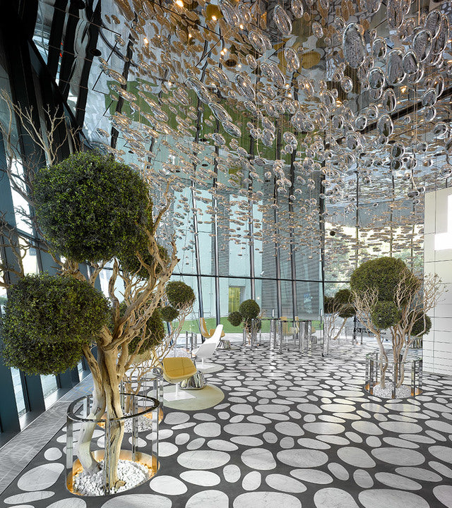 A series of large pebbles floating under an aluminum disc are reacted in the disc itself and in one another, pinging the light between their smooth biomorphic surfaces. During the day, it is a sculpture which reacts the dynamics of natural light and the movement of the people around it.