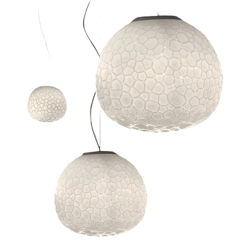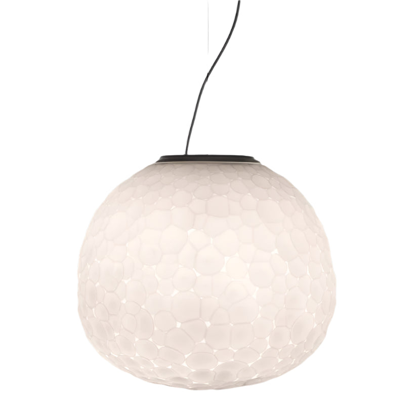 The double-layer artistic glass diffuser is handmade using the mould-blowing craft technique followed by grinding, with the end result resembling the age-old Murano art of ‘battuto’ glass with its textured, beaten look.