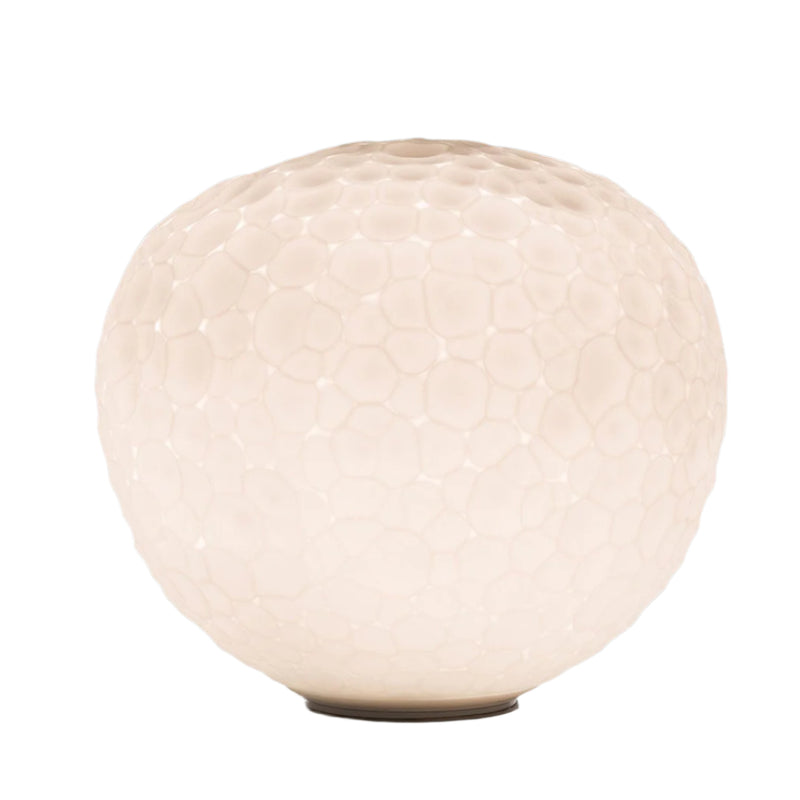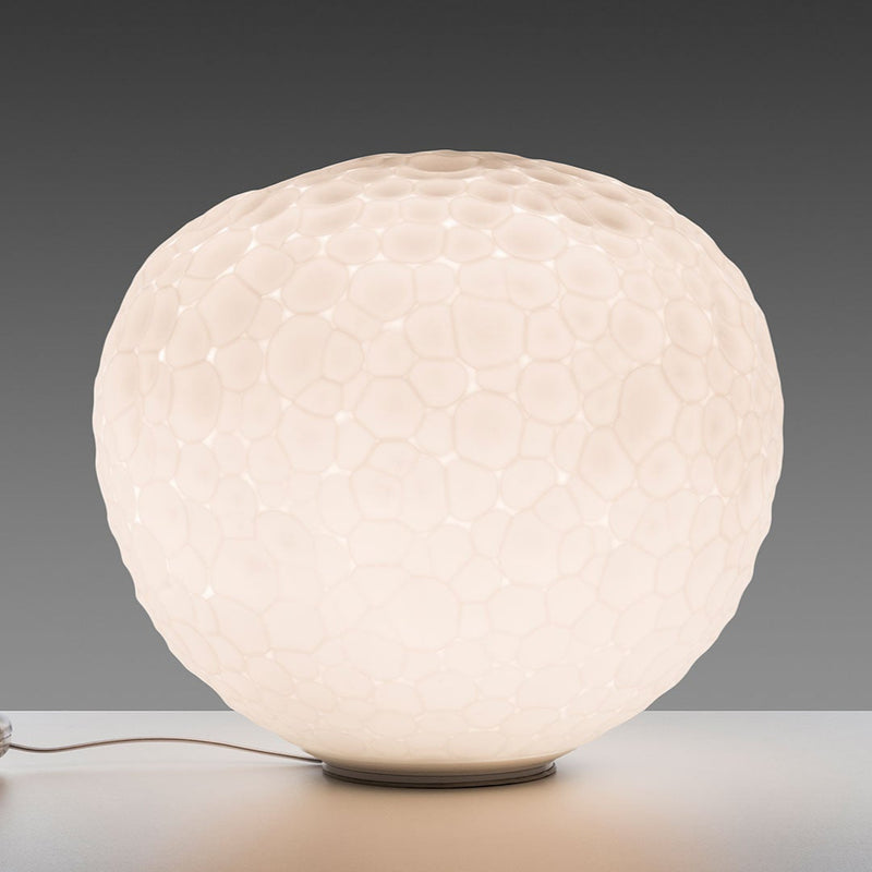 The Meteorite light collection was created using a new technique developed by designers, Pio and Tito Toso for Artemide. The brothers and architects took the traditional mouth-blown glass tradition a step further with Venetian beaten glass and a new grinding process. The result is a glass diffuser with an unfinished, raw texture. The final stage includes frosting the diffuser and placing it onto an aluminium stem and base.