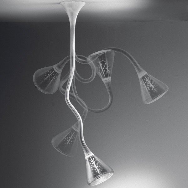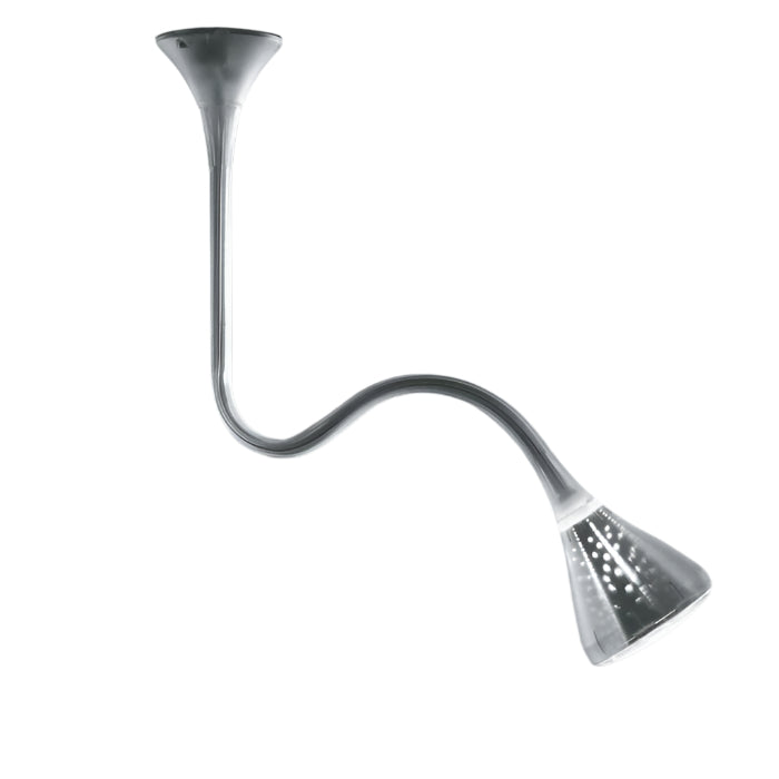 Flexible painted steel structure, covered with a natural anti-yellowing silicone case; ceiling rose and diffuser in transparent rubber-effect painted polycarbonate; mirror aluminium reflector with random perforations; painted steel bottom plate.
