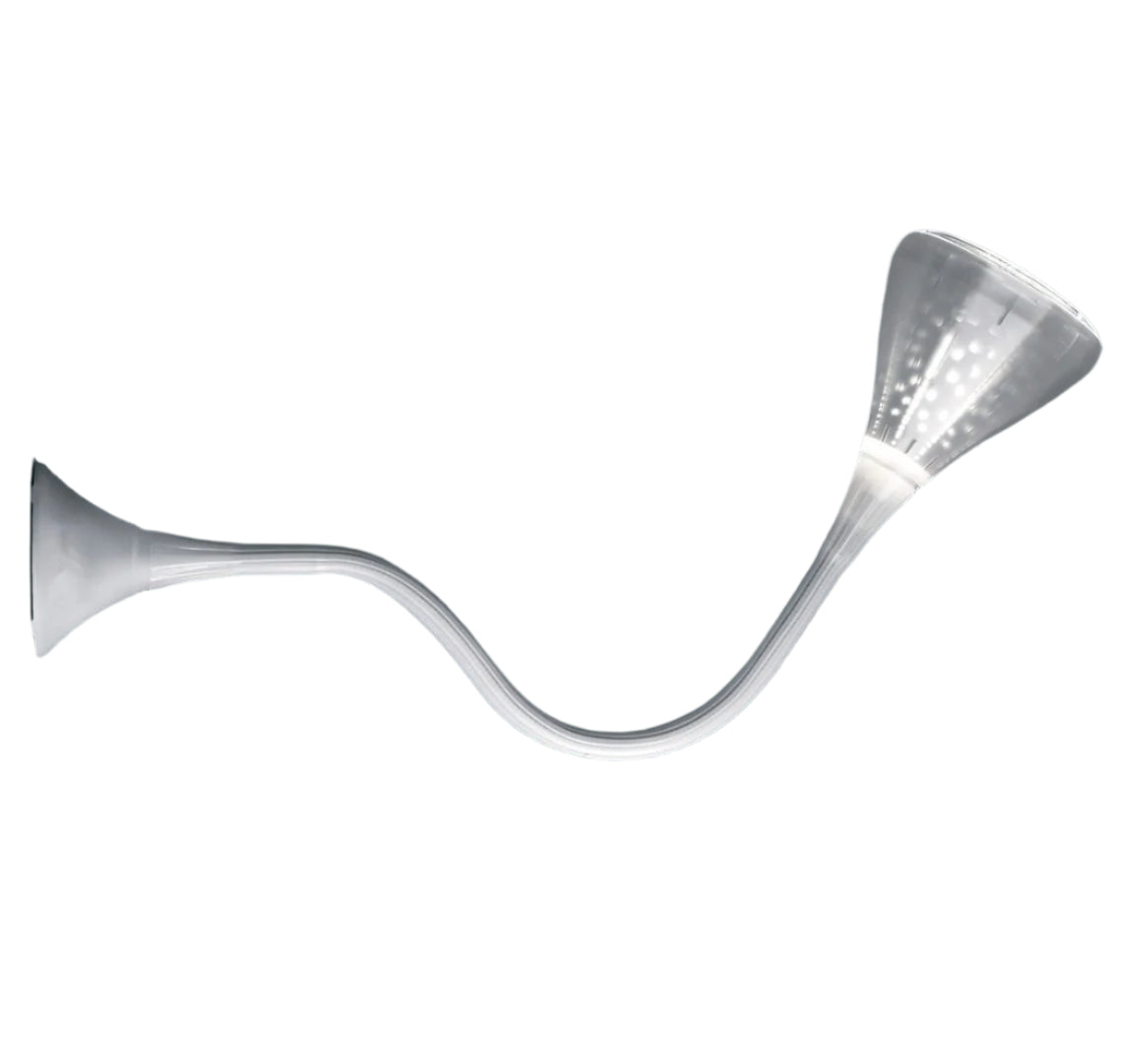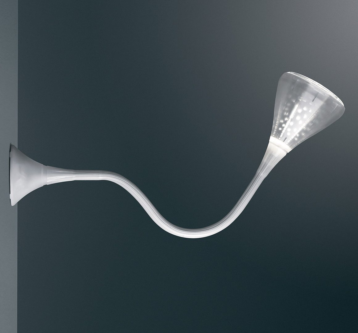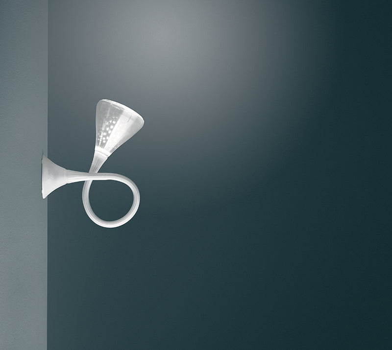 Wall/ceiling lamp with flexible painted steel structure, covered with a natural anti-yellowing silicone case; wall attachment and diffuser in transparent rubber-effect painted polycarbonate; mirror aluminium reflector with random perforations; painted steel bottom plate. The new internal diffuser is reinterpreting the old fluorescent lamp using a modern LED source, this guarantees the same optical performance with less power consumption and a better quality of light