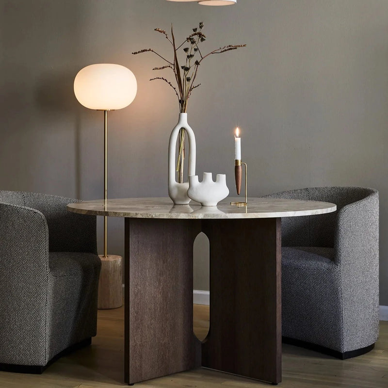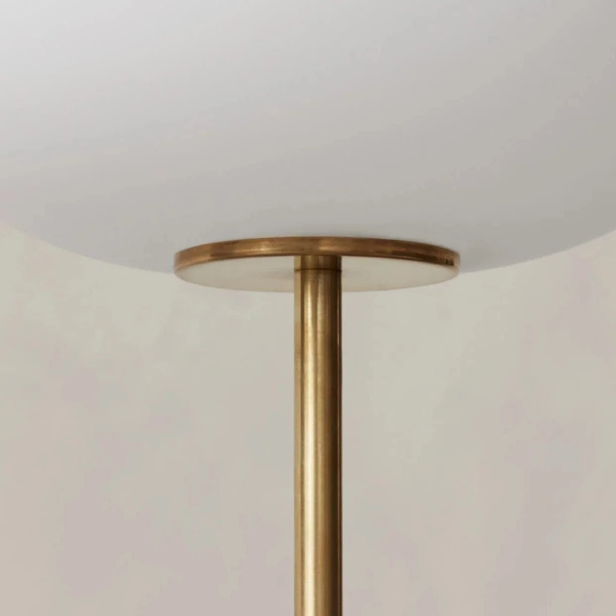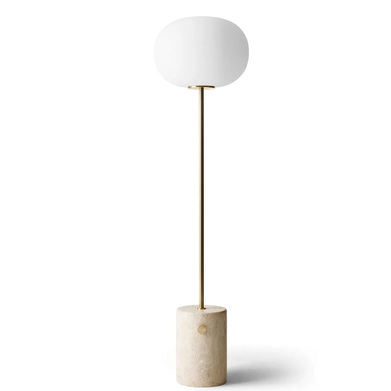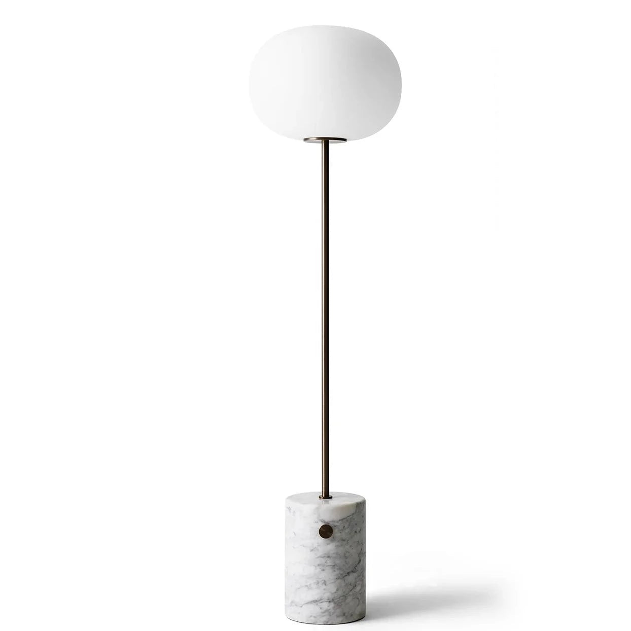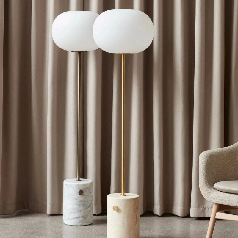 The JWDA Floor Lamp is part of a collection of lighting inspired by traditional oil lamps. Crafted from contrasting materials, the elegant yet bold design is a lesson in refinement and a study in geometry. An elliptical opal glass shade, a slender metal stem, and a rectangular marble base fitted with a dimmer switch come together to create this timeless addition to modern spaces.