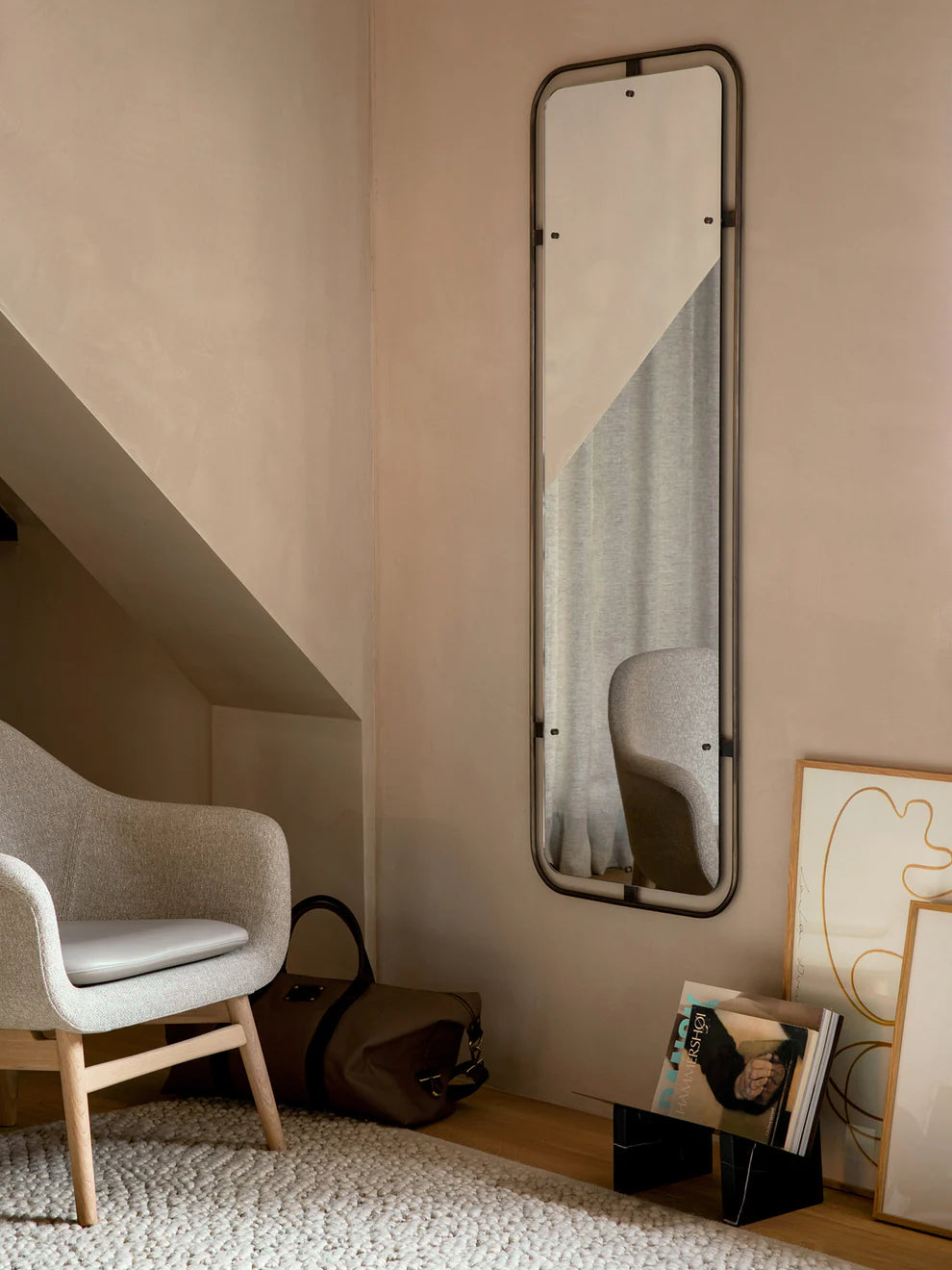 Nimbus, a refreshingly simple mirror in bronzed brass and light-reflecting glass which defines a space with its soothing and sophisticated round shape. A mirror isn’t merely purely functional: since ancient times, they have reflected the style of a period—framed by ornate Baroque flourishes or Gothic arches and the simple lines of the Bauhaus movement.