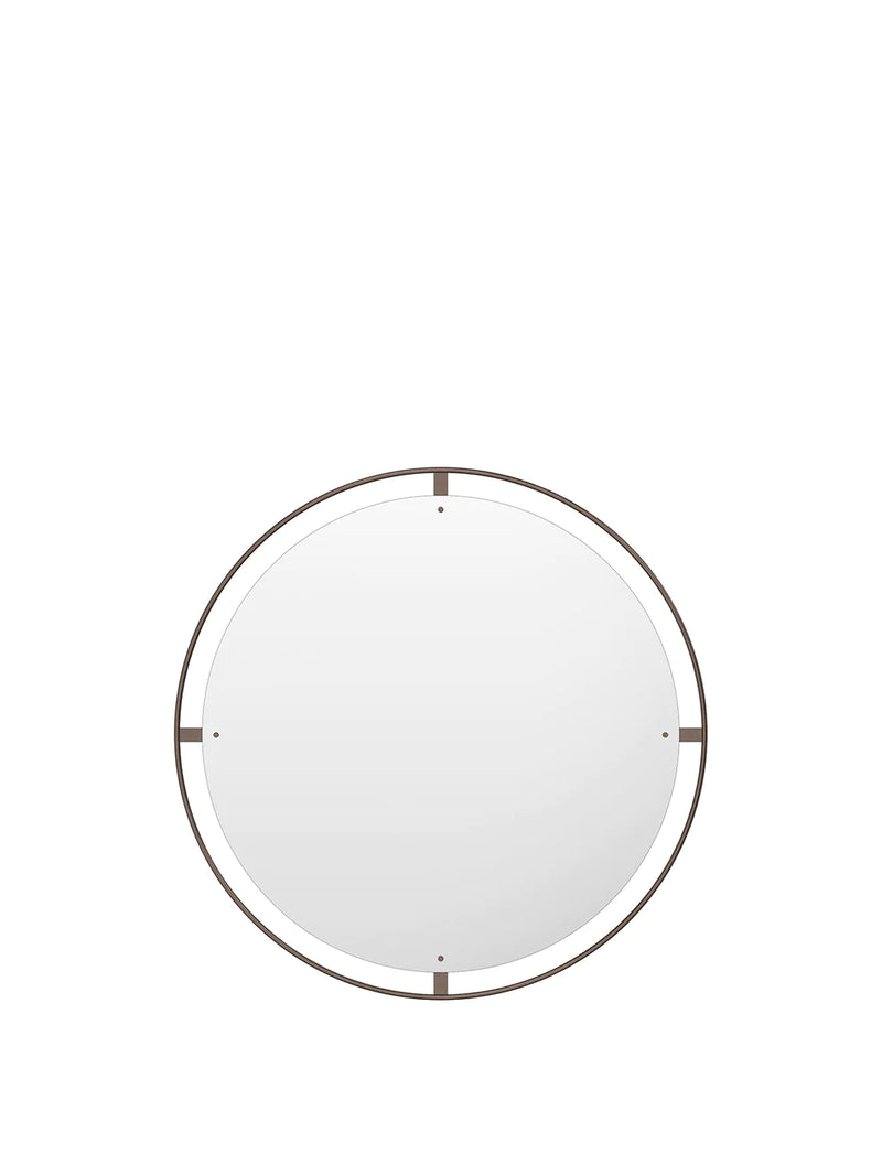 Surrounded with a bronzed or polished solid brass frame, held in place with decorative screws, the Nimbus mirror measures 110 cm in diameter, making it ideal as a functional object, as well as a decorative addition to homes, hotels or offices.