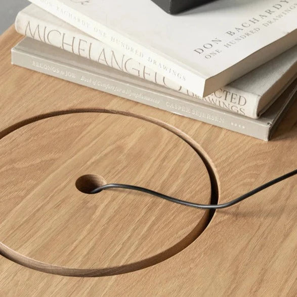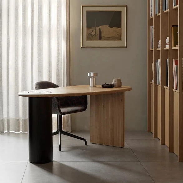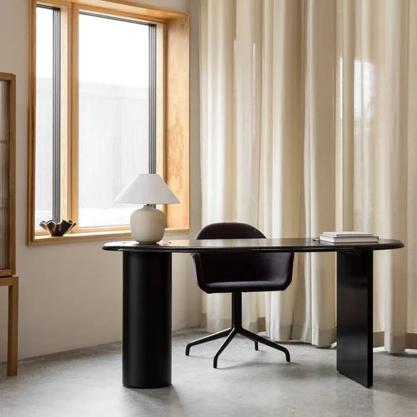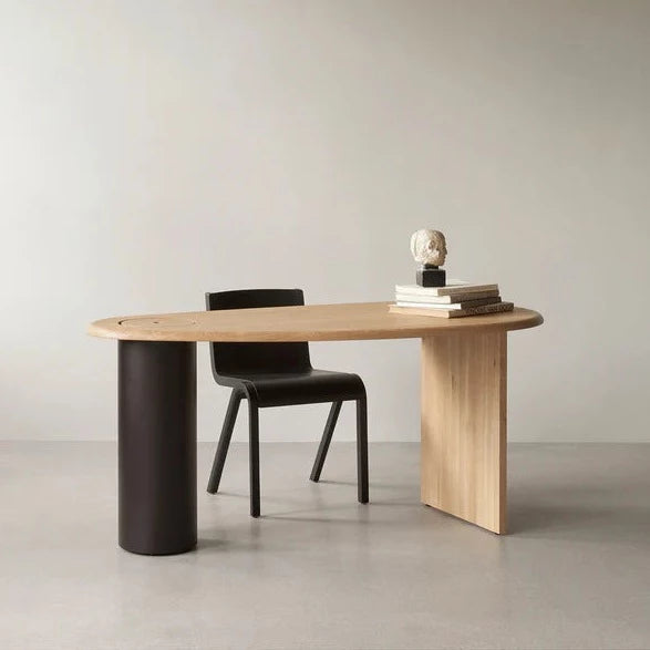 The Eclipse Desk is a celebration of materials and form. Named after its concave and convex form that resembles the illuminated passage of celestial bodies in the sky, the Fred Rigby design has a distinctive, asymmetrical silhouette that invites to touch. Available in solid oak, dark-oiled oak and oiled natural oak with a black painted leg, the tabletop is fitted with a lid that lifts to reveal hidden storage within the supportive steel column, ensuring desk space remains free of clutter.