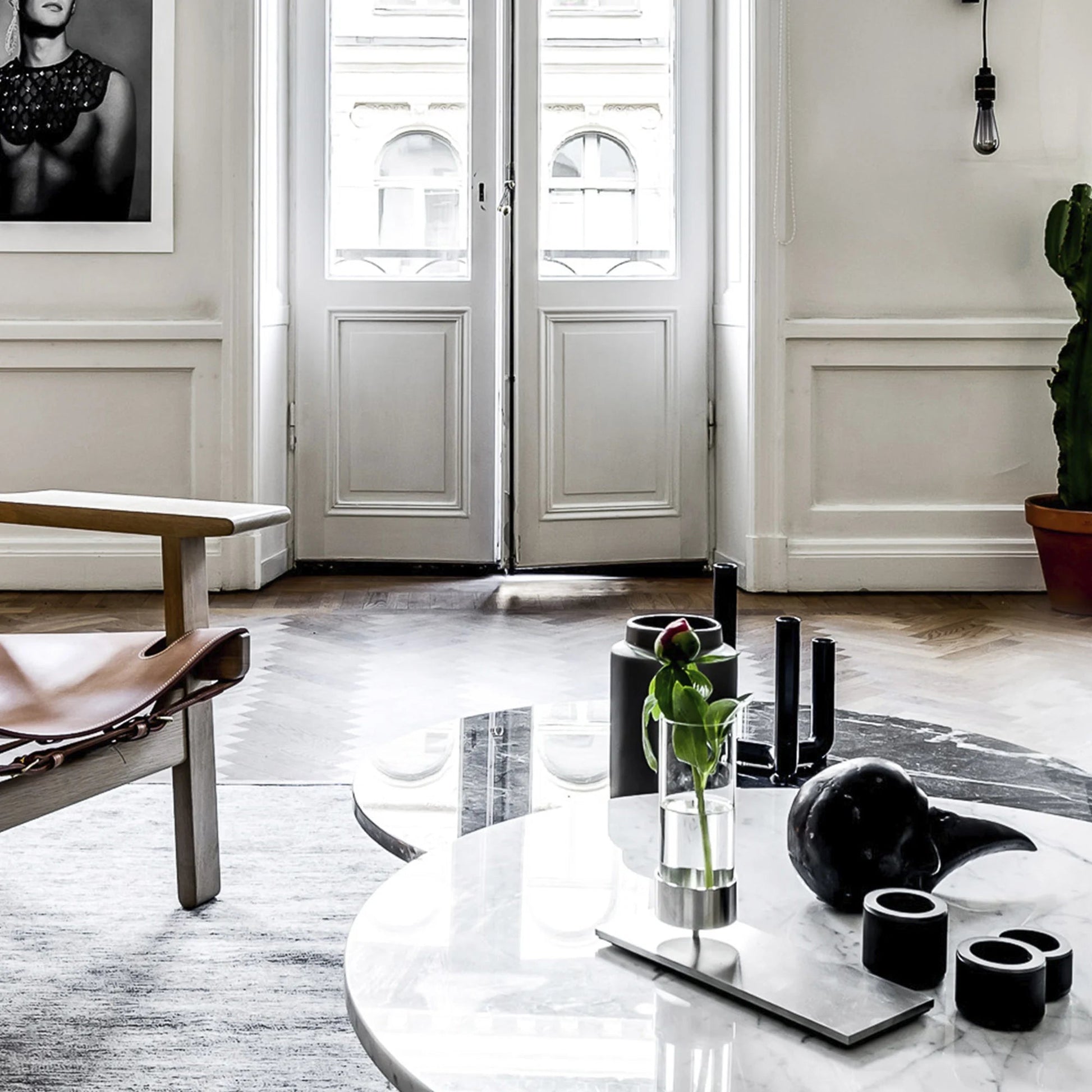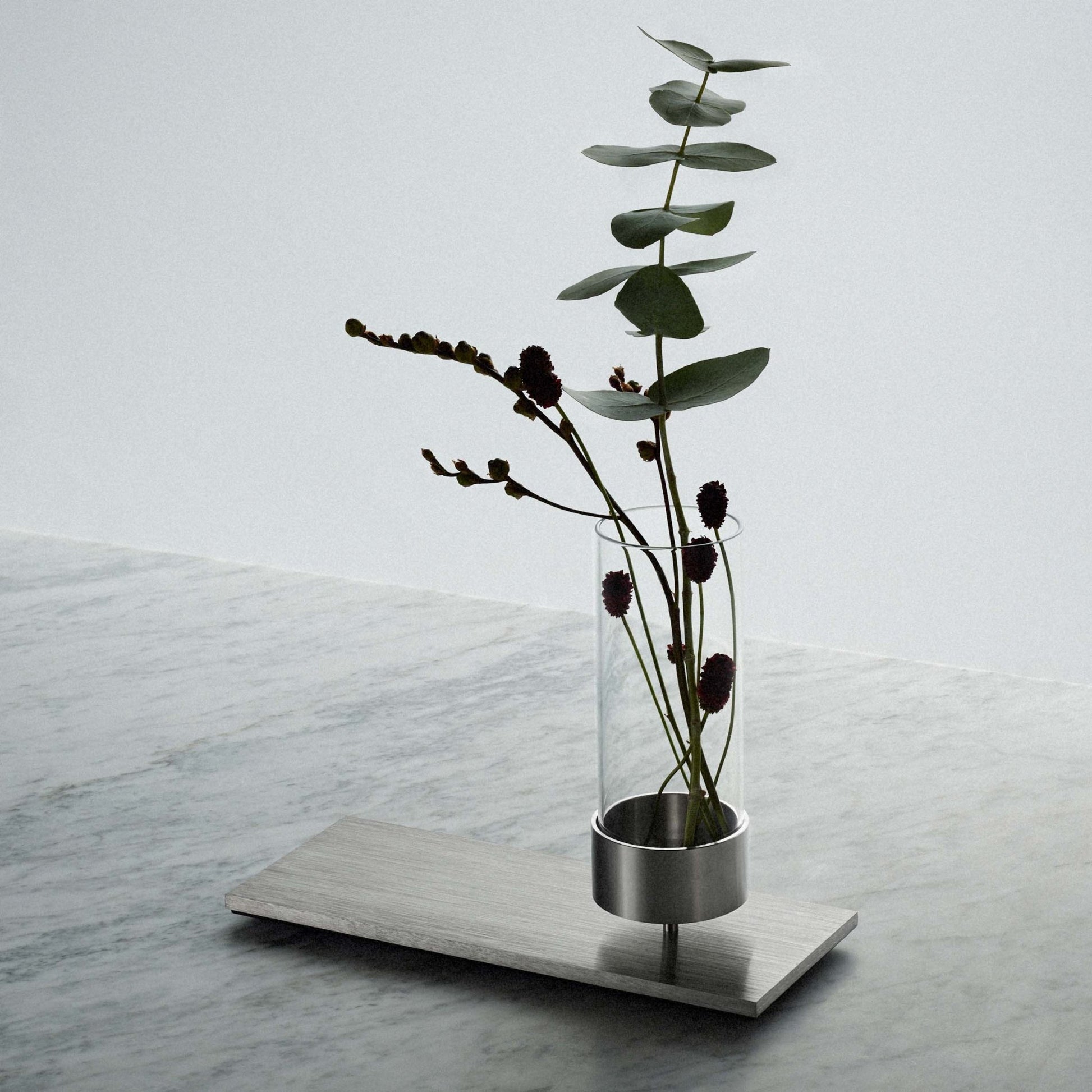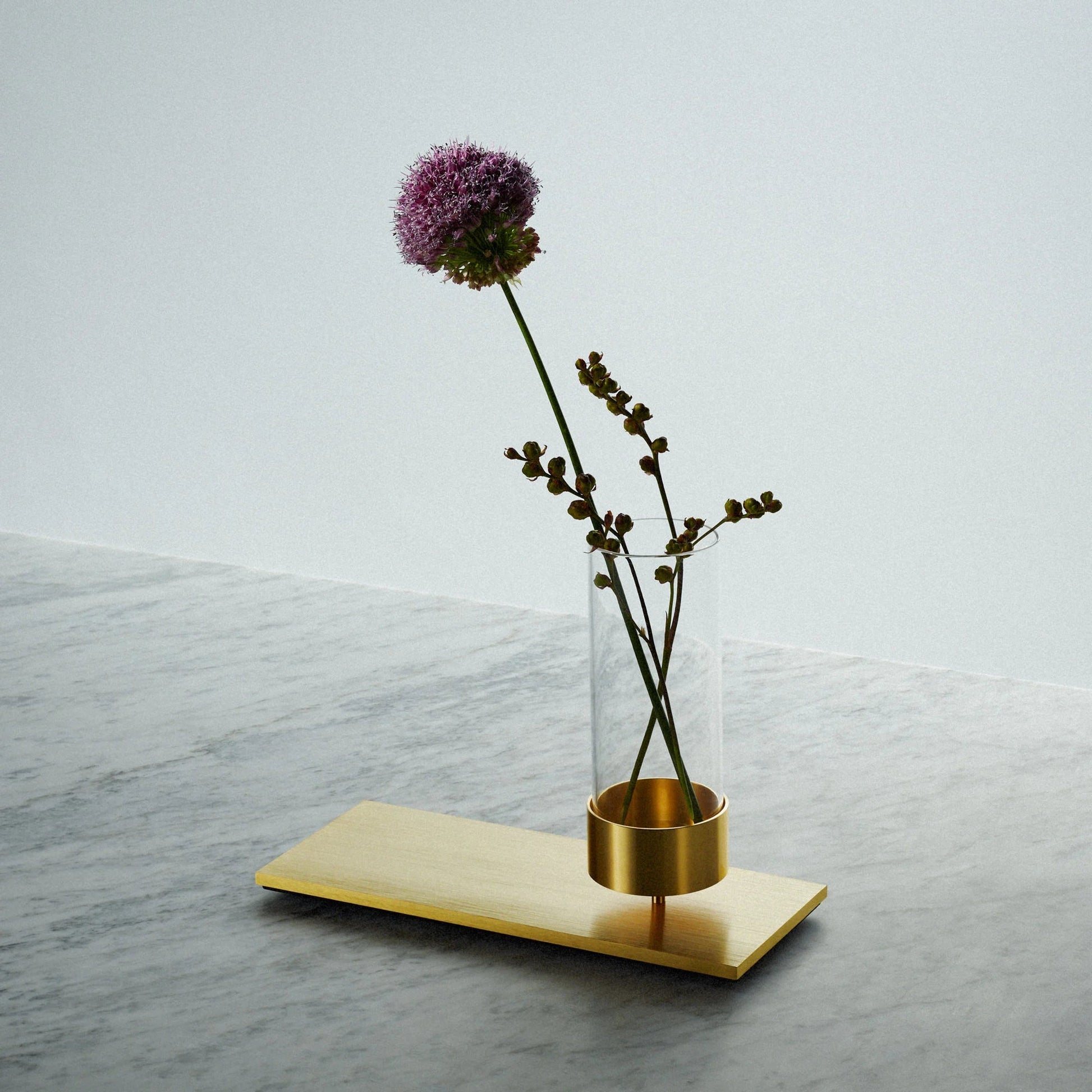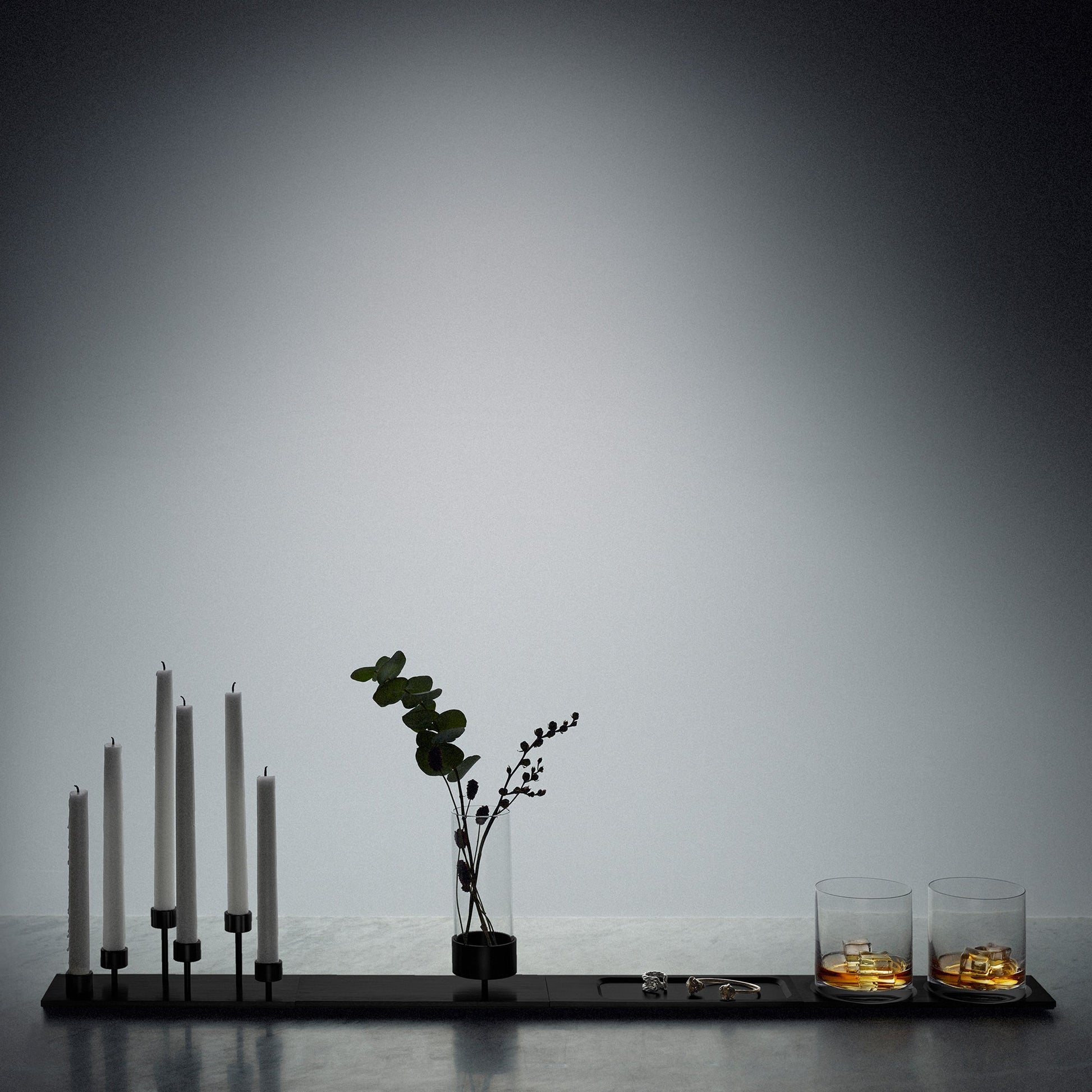 MACHINED is a range of solid metal plates that have been skillfully machined from 6mm steel, brass or black metal to accommodate interior accessories, including - CANDELABRA, flower VASE, WHISKY glasses and a simple TRAY. They can be displayed individually or placed side by side to make a stunning table display.