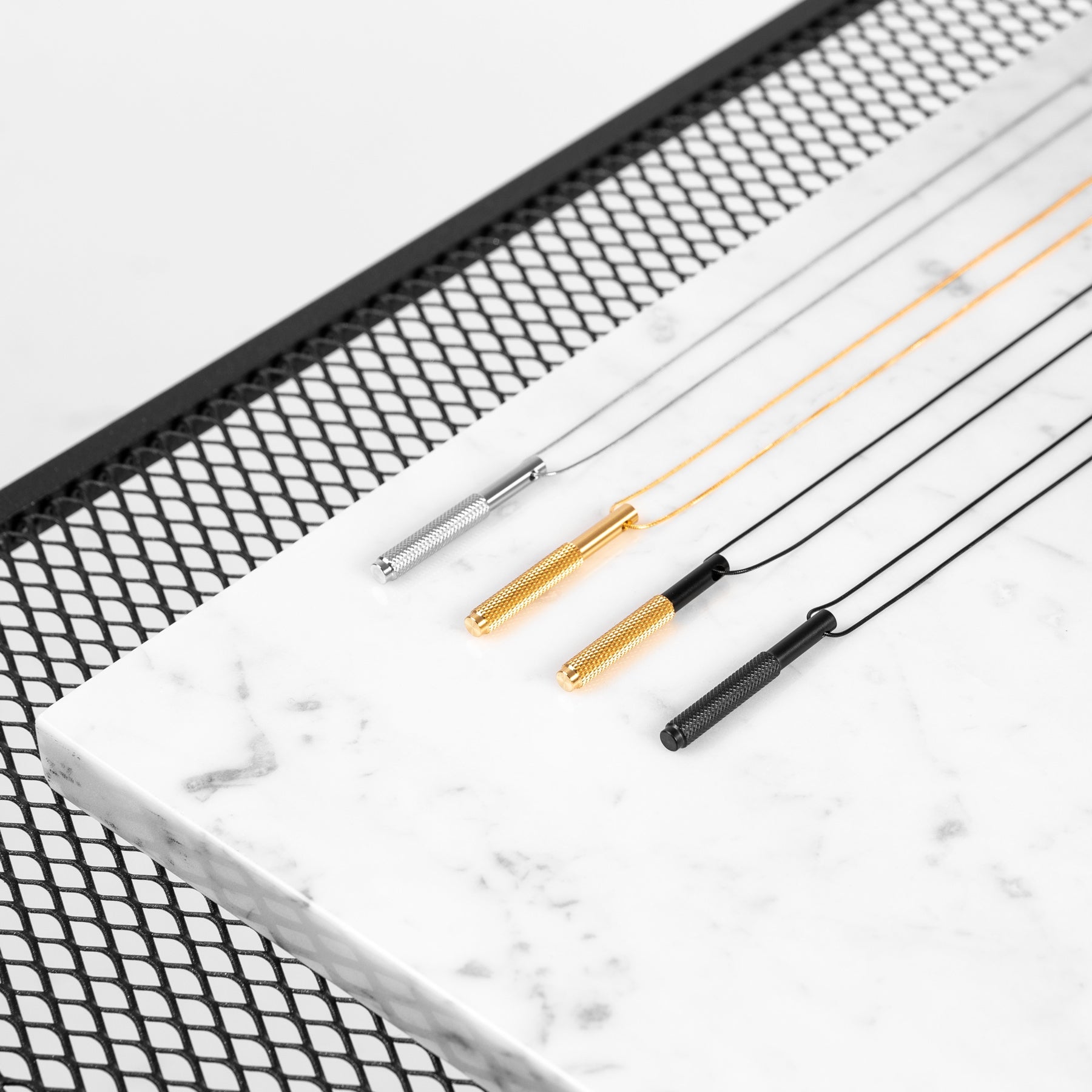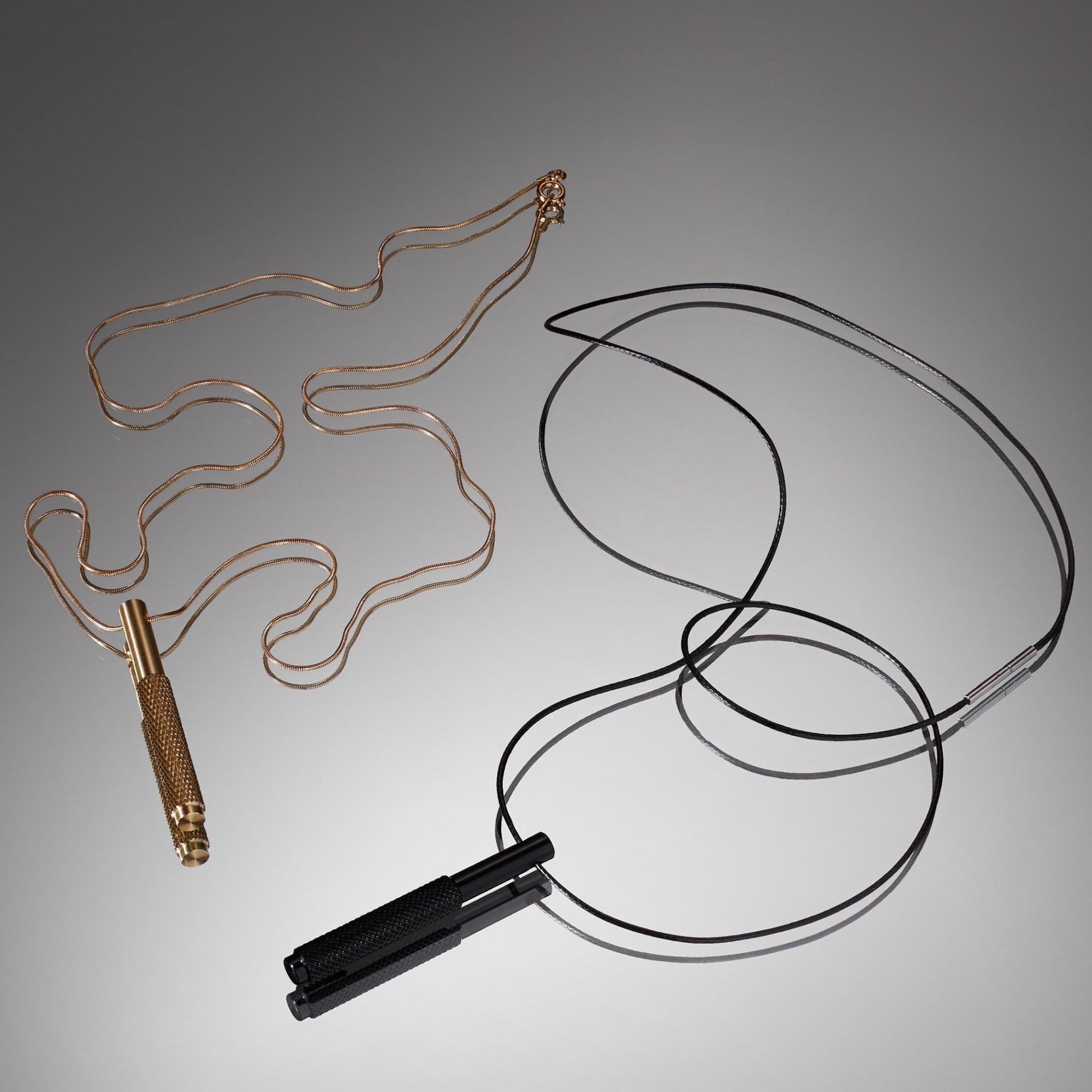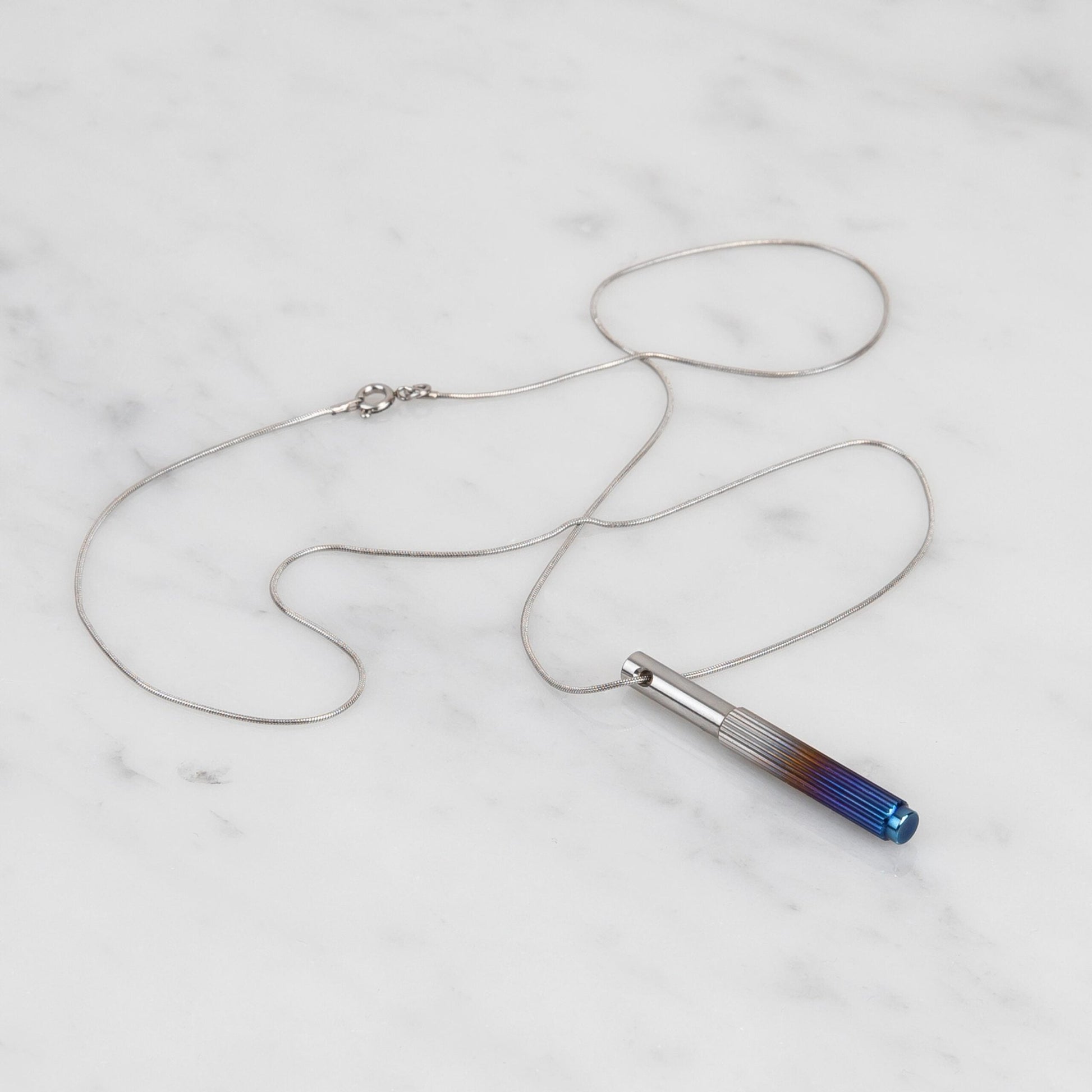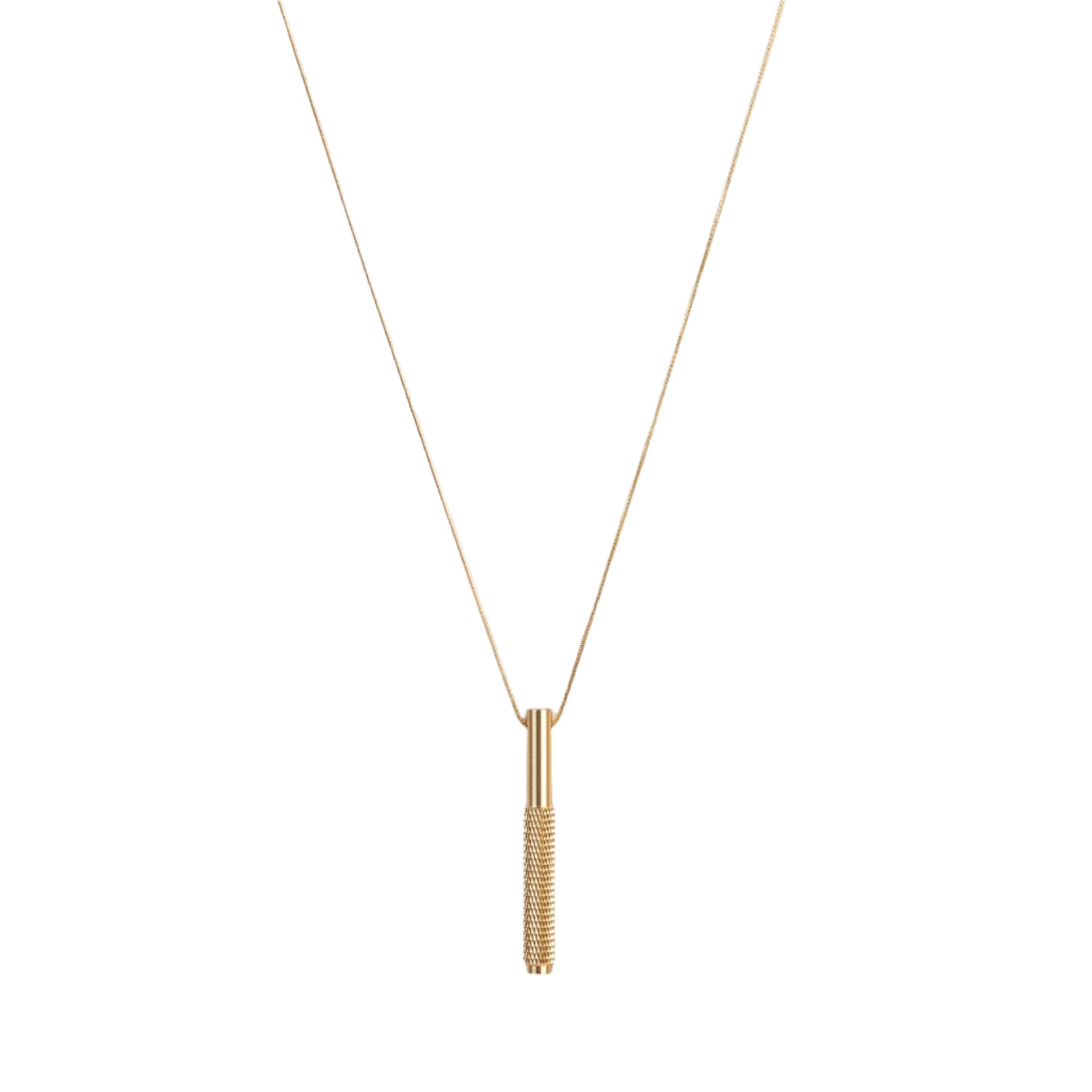 A NECKLACE with a vertical pendant machined from solid brass and black metal or burnt steel