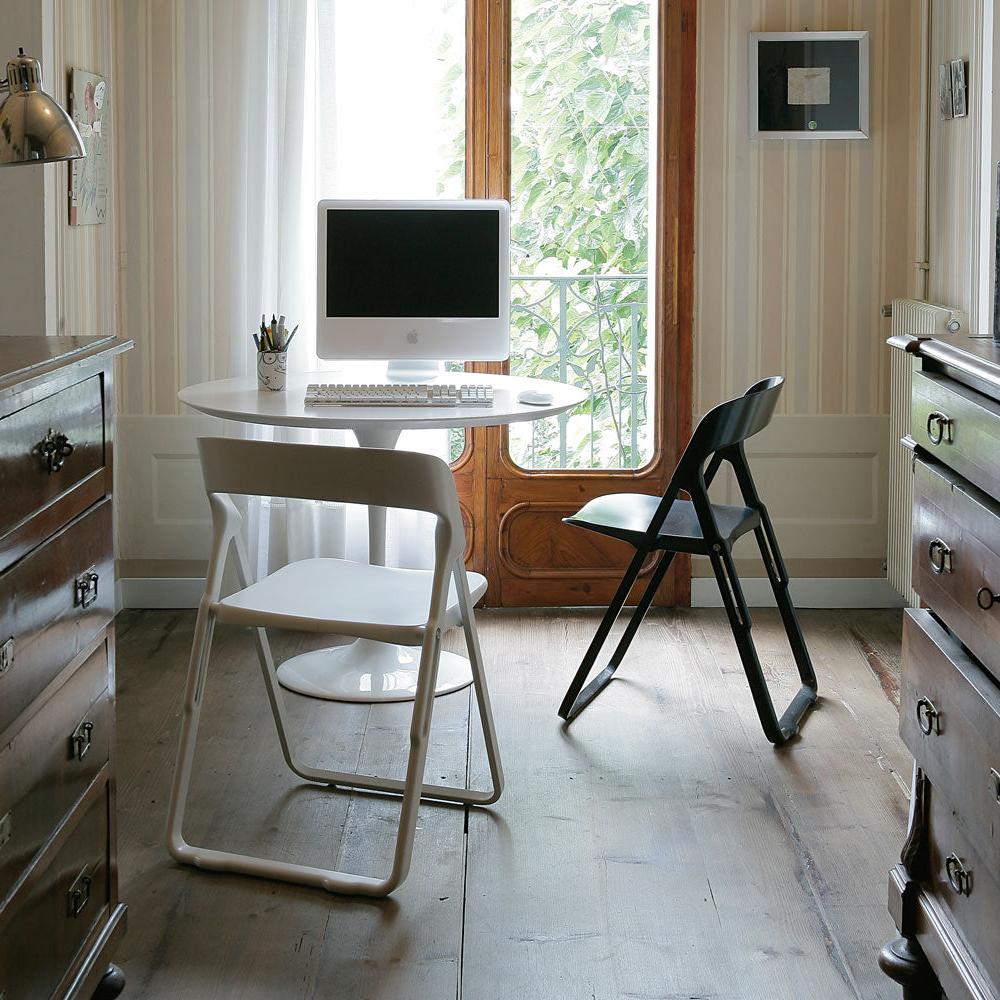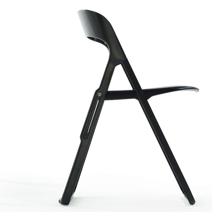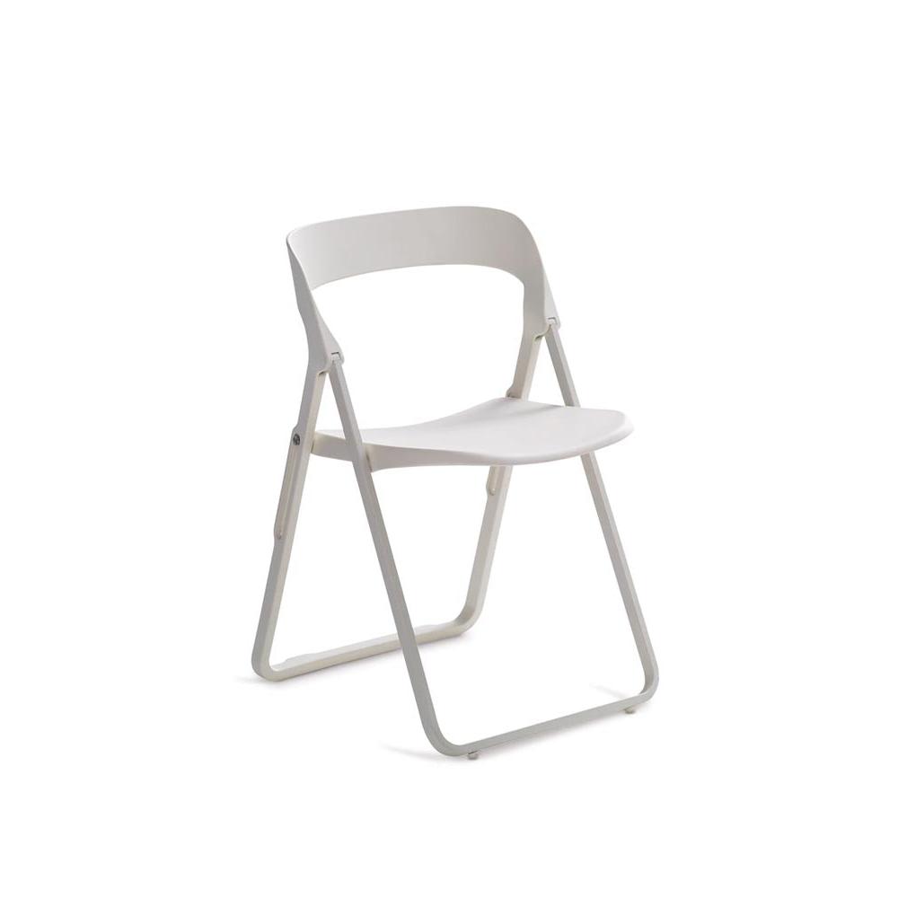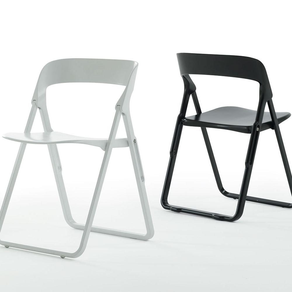 The strength of the Bek chair stays in the happy marriage between rigidity and lightness, between the important technical solution with injection reinforced with fiberglass and its simple and defined figure. Not only a beautiful and elegant chair but also a folding chair whose slots on the rear supports emphasize the sliding movement of the seat during opening and closing.