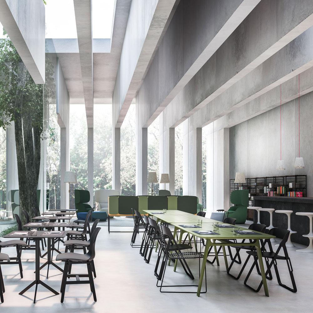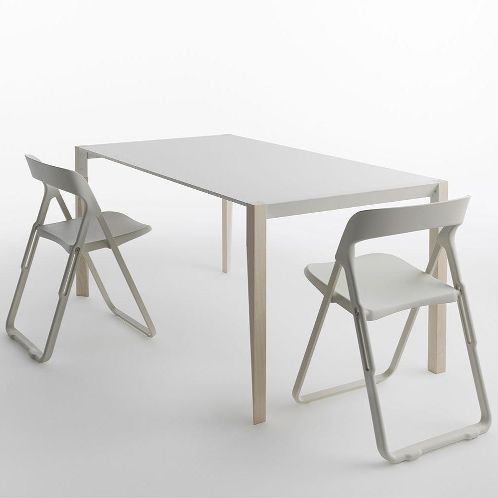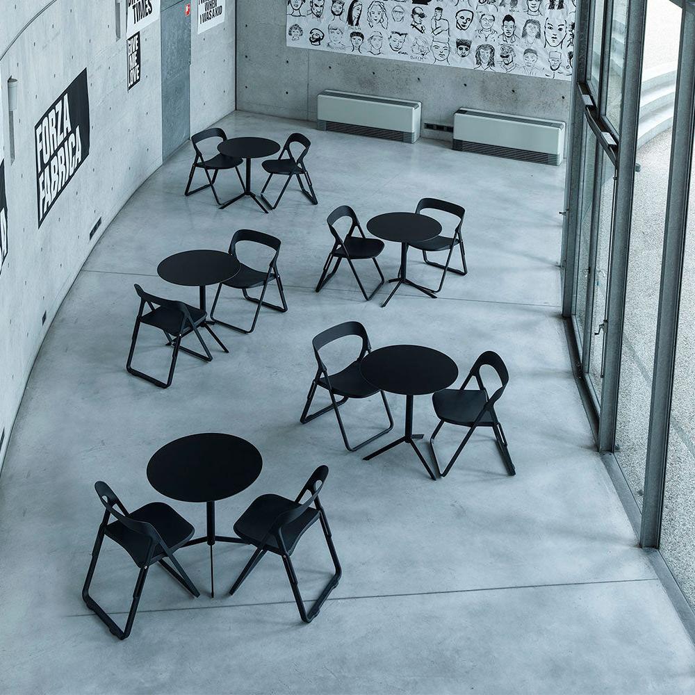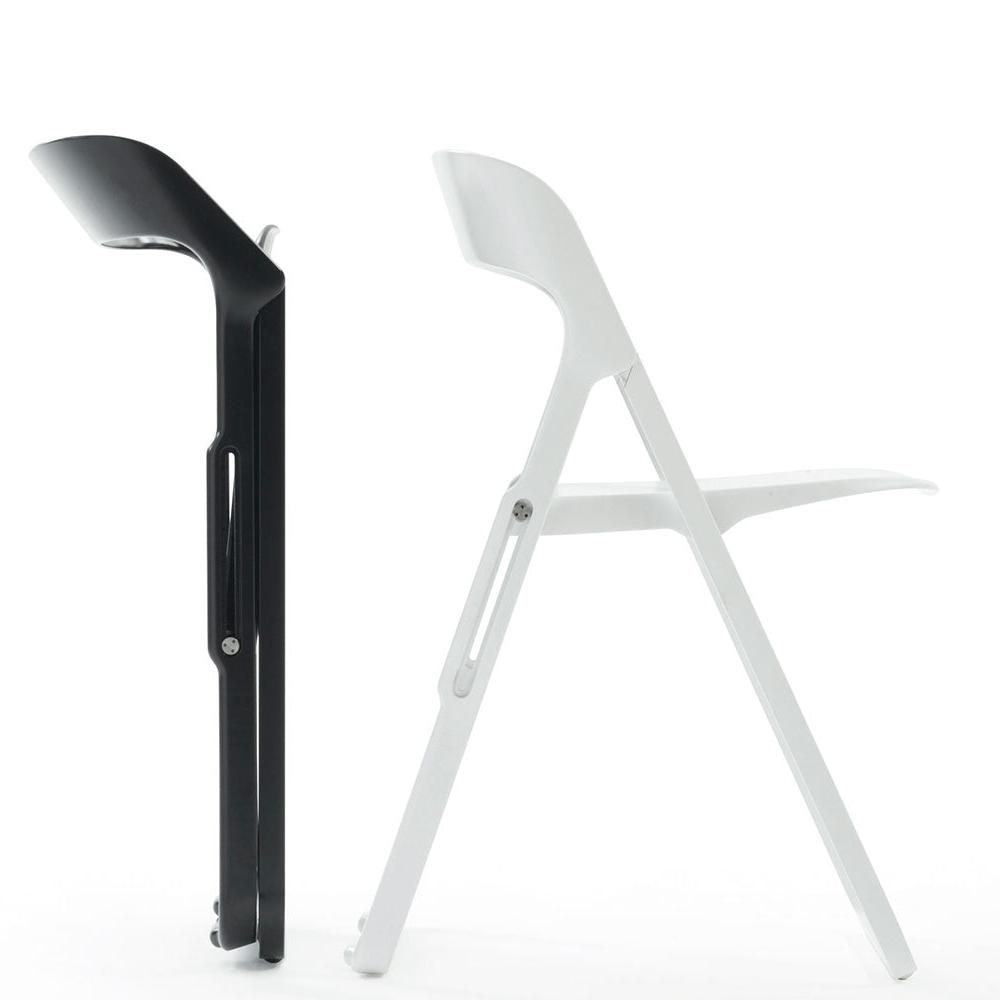 The strength of the Bek chair stays in the happy marriage between rigidity and lightness, between the important technical solution with injection reinforced with fiberglass and its simple and defined figure. Not only a beautiful and elegant chair but also a folding chair whose slots on the rear supports emphasize the sliding movement of the seat during opening and closing.