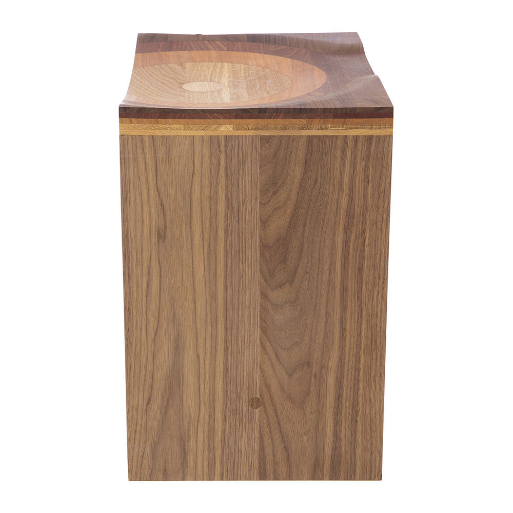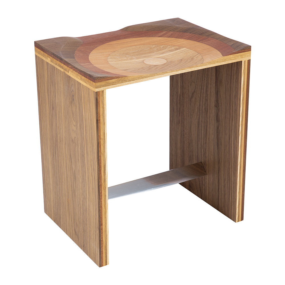 The seat shape, carved with industrial technology yet entirely hand-finished, feels soft and rich due to both the ductility of wood and Horm's passion for craftsmanship. Slide your hand along the surface to feel the seamless transition between walnut, mahogany, cherry, oak and ash. Seat made from plywood using five different types of wood (walnut, mahogany, cherry, oak and beech). Legs made from plywood with edging and walnut veneer. Vegetable oil finish. Feet rests made from extruded anodized aluminium.