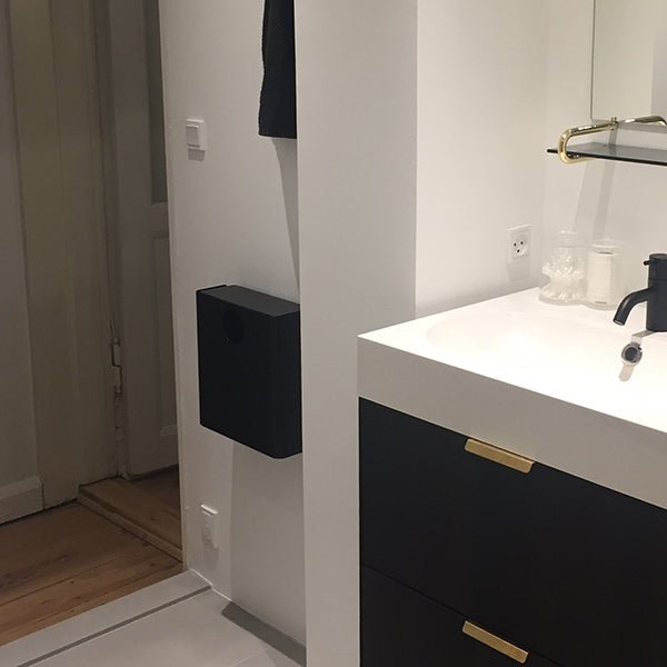 The D line Wall Mounted Waste Bin is a member of Knud Holscher's Sanitary AISI 316 Range. Constructed of rust-resistant, non-corrosive, marine quality steel, this bin is perfect for bathroom settings, withstanding humid environments.