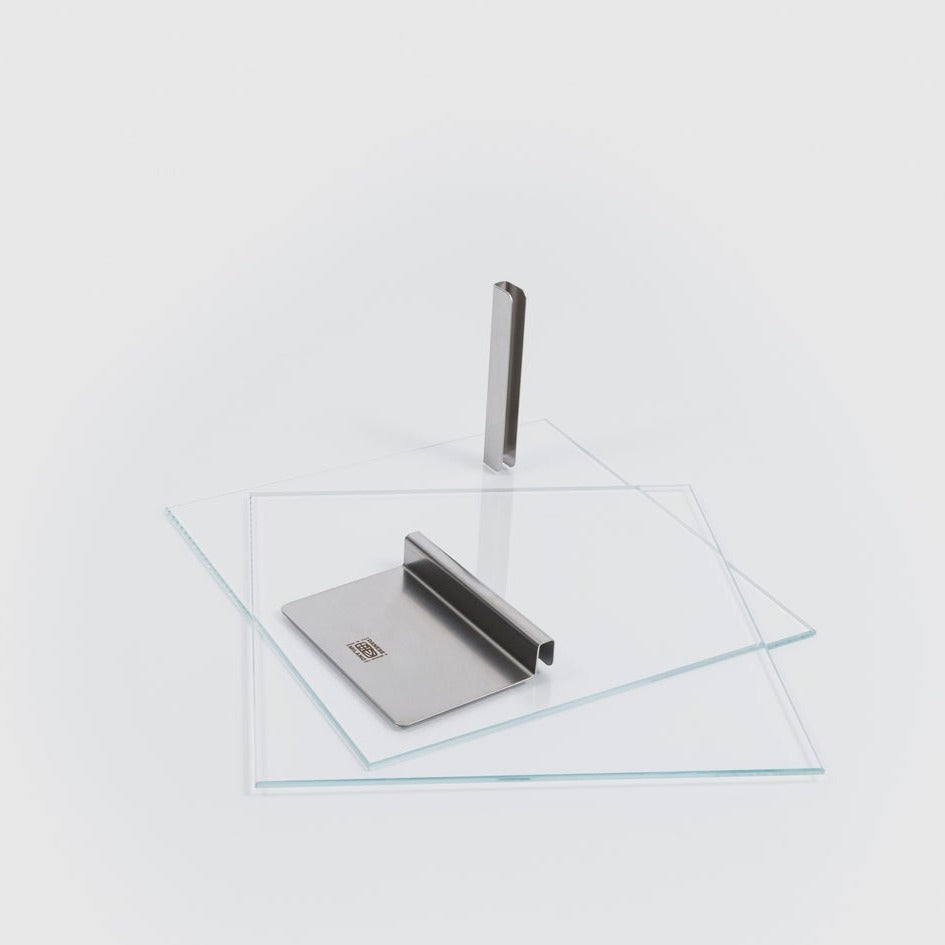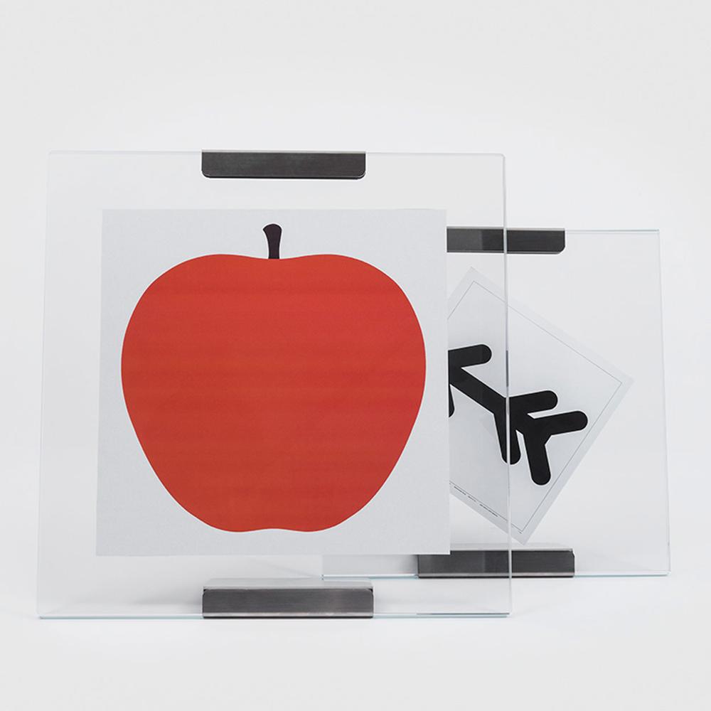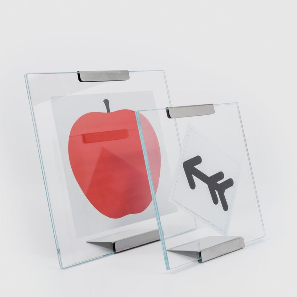 Galapagos is a picture frame made of two square sheets of ultrawhite glass, held together and supported by satin finish stainless steel elements.