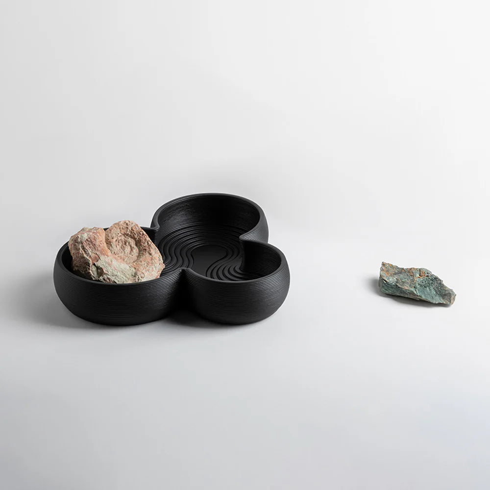 Clay 3D printing is an innovative and experimental technology due to the difficulties involved in creating volumes with dense fluid materials: the shapes are in fact created layer upon layer through the LDM (Liquid Deposition Modeling) process. Once solidified and cooked, the clay is then subjected to finishing with an opaque black crystalline that gives it the final color and protects the material making it suitable for contact with food.