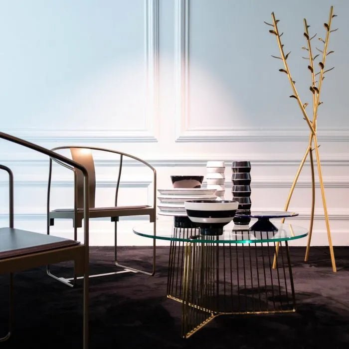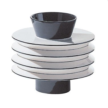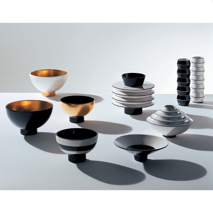 Linde Burkhardt declined the circle geometry in black and white, with edges highlighted by a thin line that creates the positive vs the negative. Surprisingly, she combined gilded surfaces both to the black and the white, inside such as outside of the cup-shaped vessels. And then she designed pearly ceramics, blue and silver stands or oxidized copper and gold vessels.