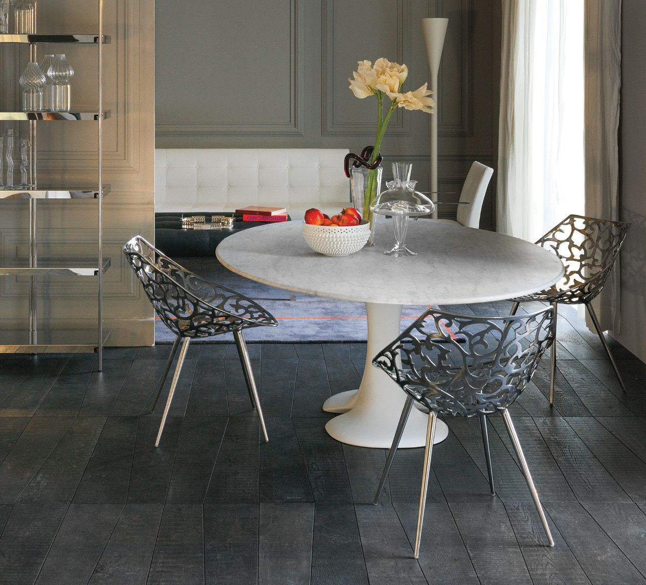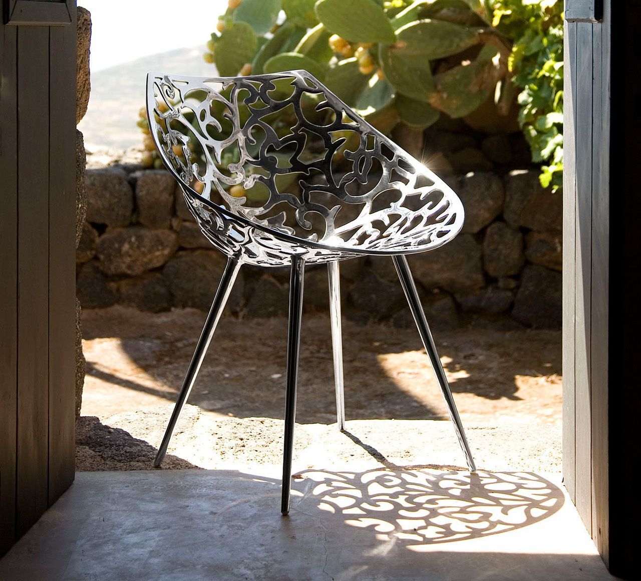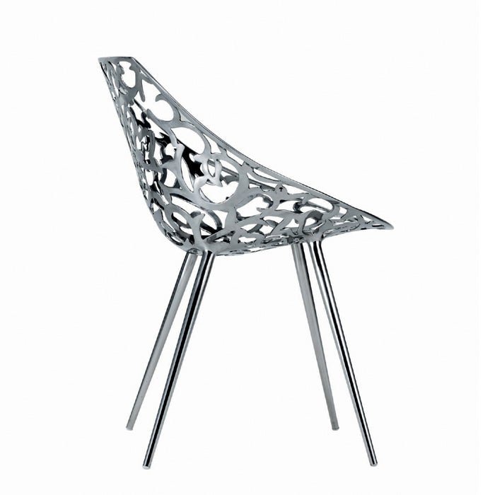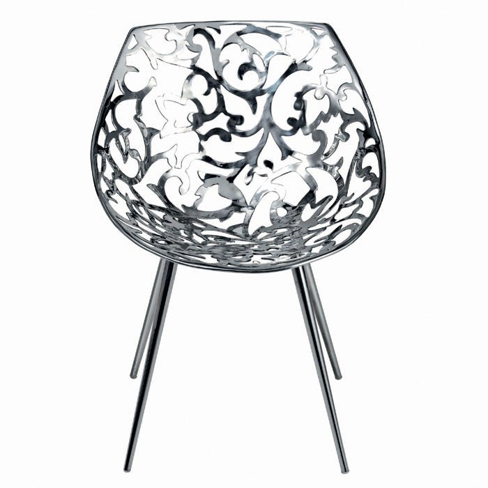Driade Miss Lacy Chair Philippe Starck - obtained from the ancient lost wax casting technique, miss lacy represents and makes accessible a baroque lace by transforming it into an embracing shell. characterized by the expertly pierced shiny mirrored stainless steel. it is unique that compares more to a jewel than to a functional object. the tapered legs are then welded to the shell, once polished, and the final result is a perfect monoblock. it is one of the products with the highest level of craftsmanship of the entire driade collection.