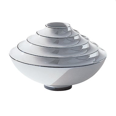 Linde Burkhardt declined the circle geometry in black and white, with edges highlighted by a thin line that creates the positive vs the negative. Surprisingly, she combined gilded surfaces both to the black and the white, inside such as outside of the cup-shaped vessels. And then she designed pearly ceramics, blue and silver stands or oxidized copper and gold vessels.