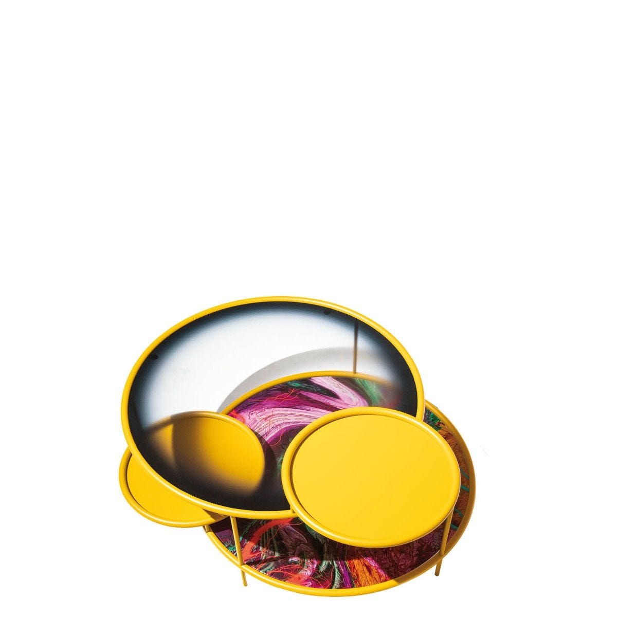 Small table composed of four circular tops overlapping each other in the two diameters of 82 and 42 cm. The “geometrical” construction of the table is based on circles inscribed among them to obtain an overall size of 100x82 cm and a height of 41 cm. Circular structure supporting the tops in 20 mm diameter steel tube and vertical support elements in 12 mm diameter steel rod, all painted in polyester powder, blue, green, yellow and anthracite finishes. Steel plate tops with a diameter of 42 cm. to match the structure colours. Lower shelf made of 6mm. extra-clear glass with a diameter of 82 cm. decorated with digital printing in four different graphics to match the colours of the structure. Top in 3+3mm extra-clear layered glass, diameter 82 cm, digitally printed in grey gradient. Indoor use only.