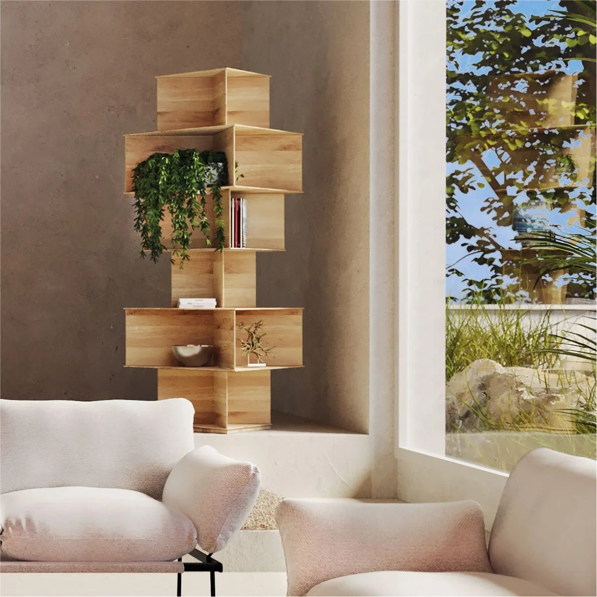 Freestanding display unit/bookcase with a revolving floor system for convenient access to the shelves arranged on the four sides of the display unit. The display unit is composed of horizontal and vertical elements in solid ribbed/half-flame oak made by joining thin 10 mm thick staves with a soft rounded edge.