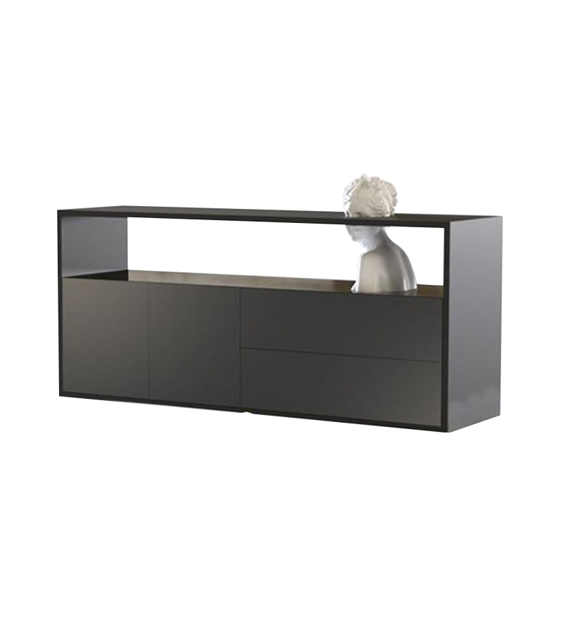 Sideboard made of 25 mm/0,98"thick medium-density wood fibreboard. Matt lacquered finish in traffic black, floor-standing plinth in mirror finish with adjustment feet for levelling. Front composed of two hinged doors with 45° bevel with movable internal shelf and two full-extension drawers with 45° bevel. Door and drawer opening system by means of push- pull. Open compartment with inserted white reconstituted marble sculpture