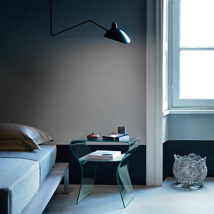 Charlotte de Nuit is a bedside table in 8 mm-thick curved glass.