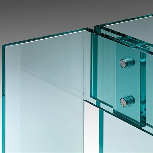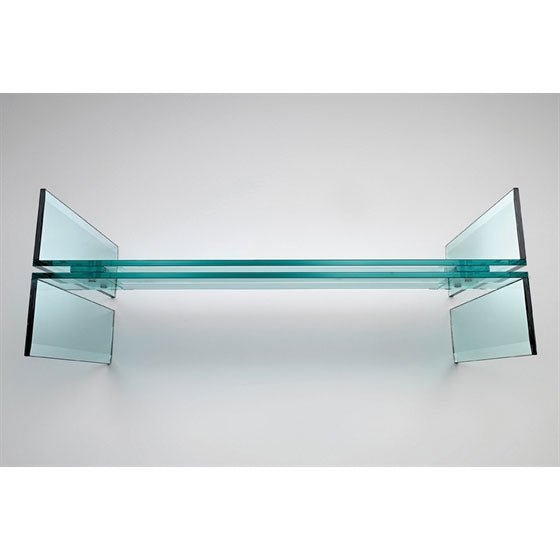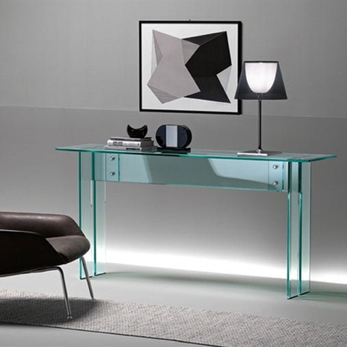 Co designed: Dante O. Benini and Luca Gonzo Console composed of a 15 mm thick transparent glass top with bevelled edges on the two shorter sides and of a base in 15 mm thick transparent welded glass with bevelled edge. Fastening elements in stainless steel.