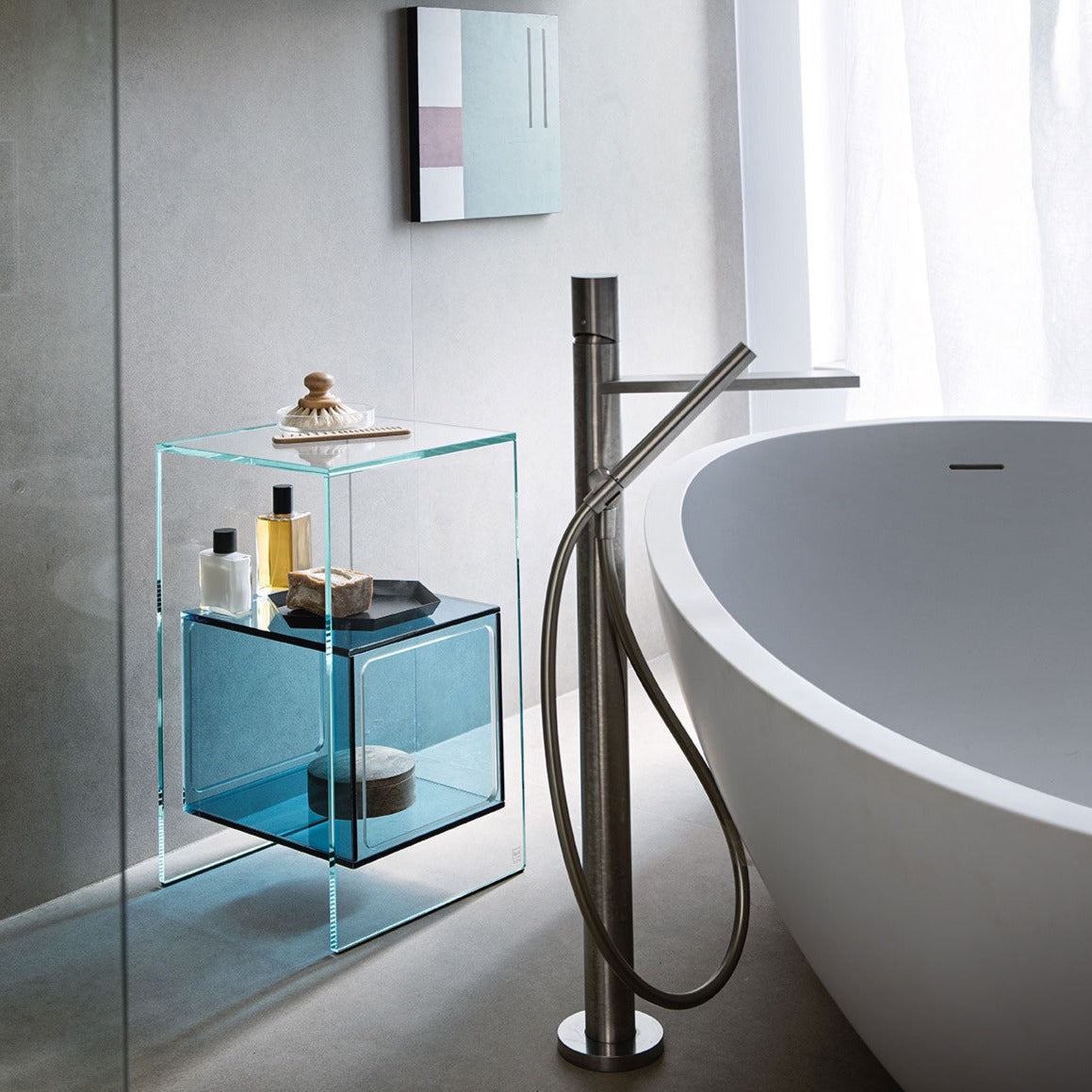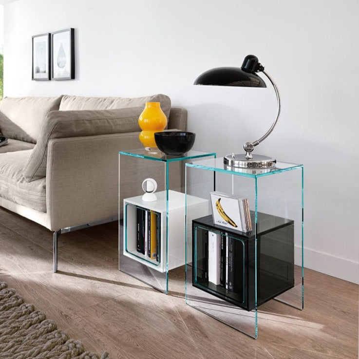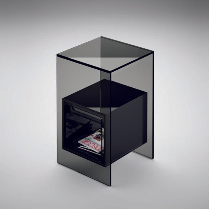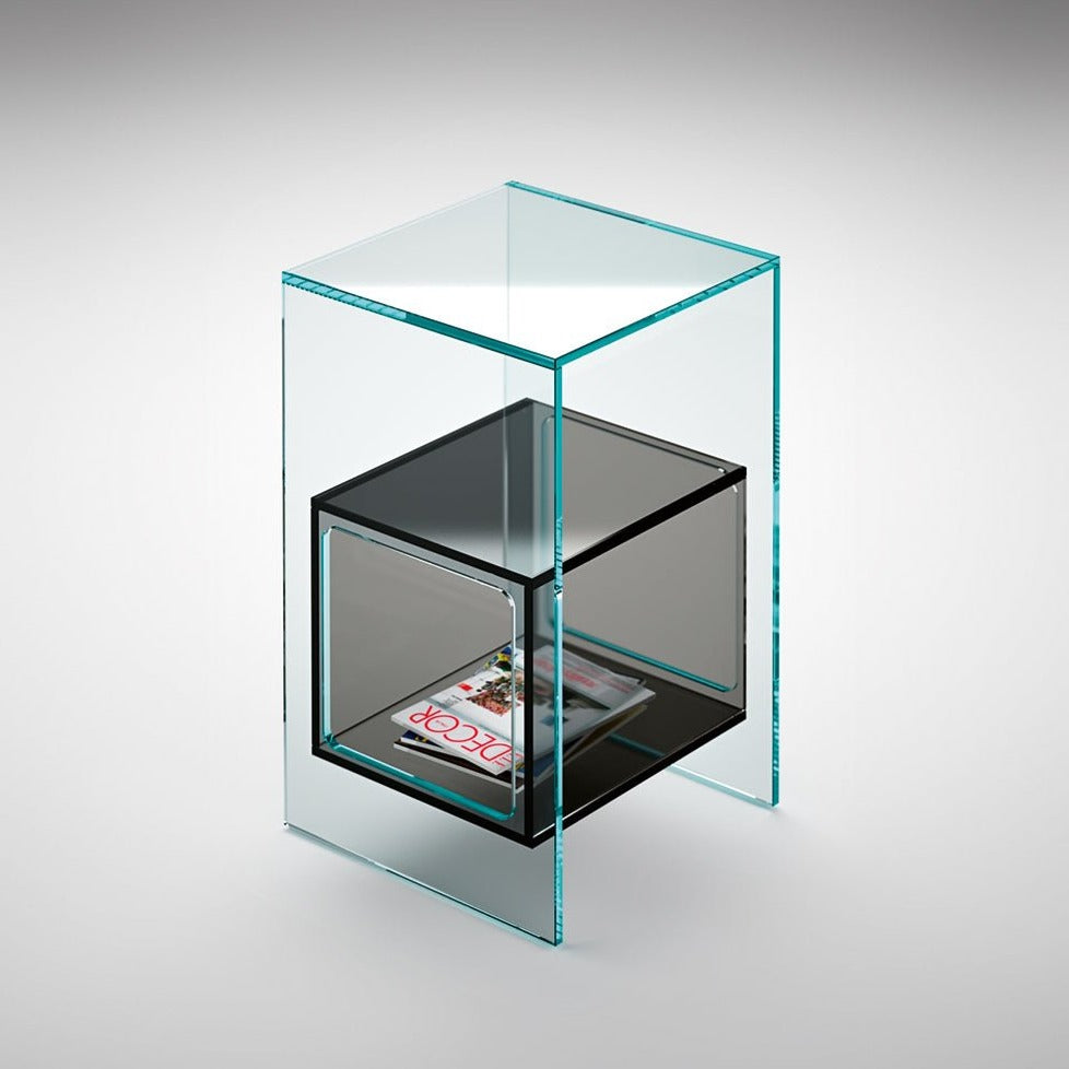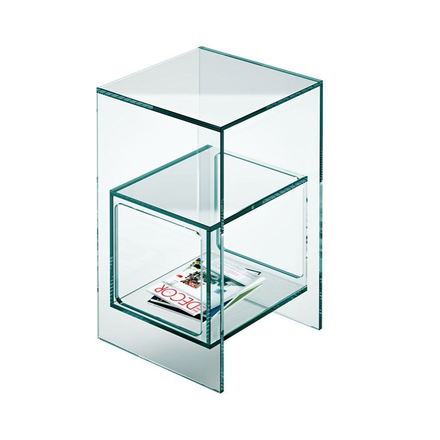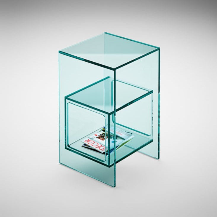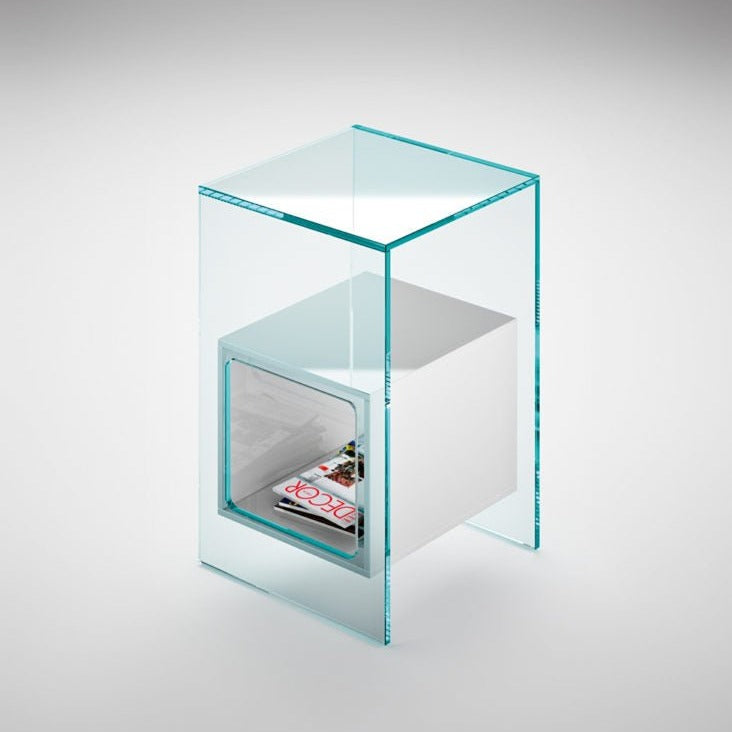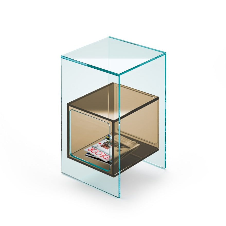 Side table with container in 10 mm welded glass. Available in various finishes: transparent glass structure and container; extralight glass structure opal white glass container; extralight glass structure, smoked grey glass container; extralight glass structure, bronze glass container; extralight glass structure, blue glass container; smoked grey glass structure, Black95 glass container.
