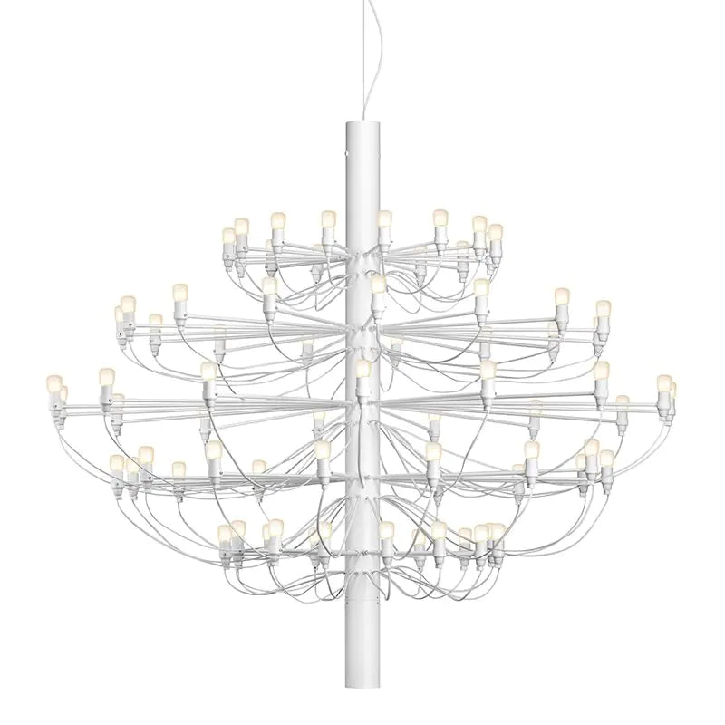 Available as an 18, 30, 50 and 75 bulb Chandelier in chrome, brass, matt black and matt white