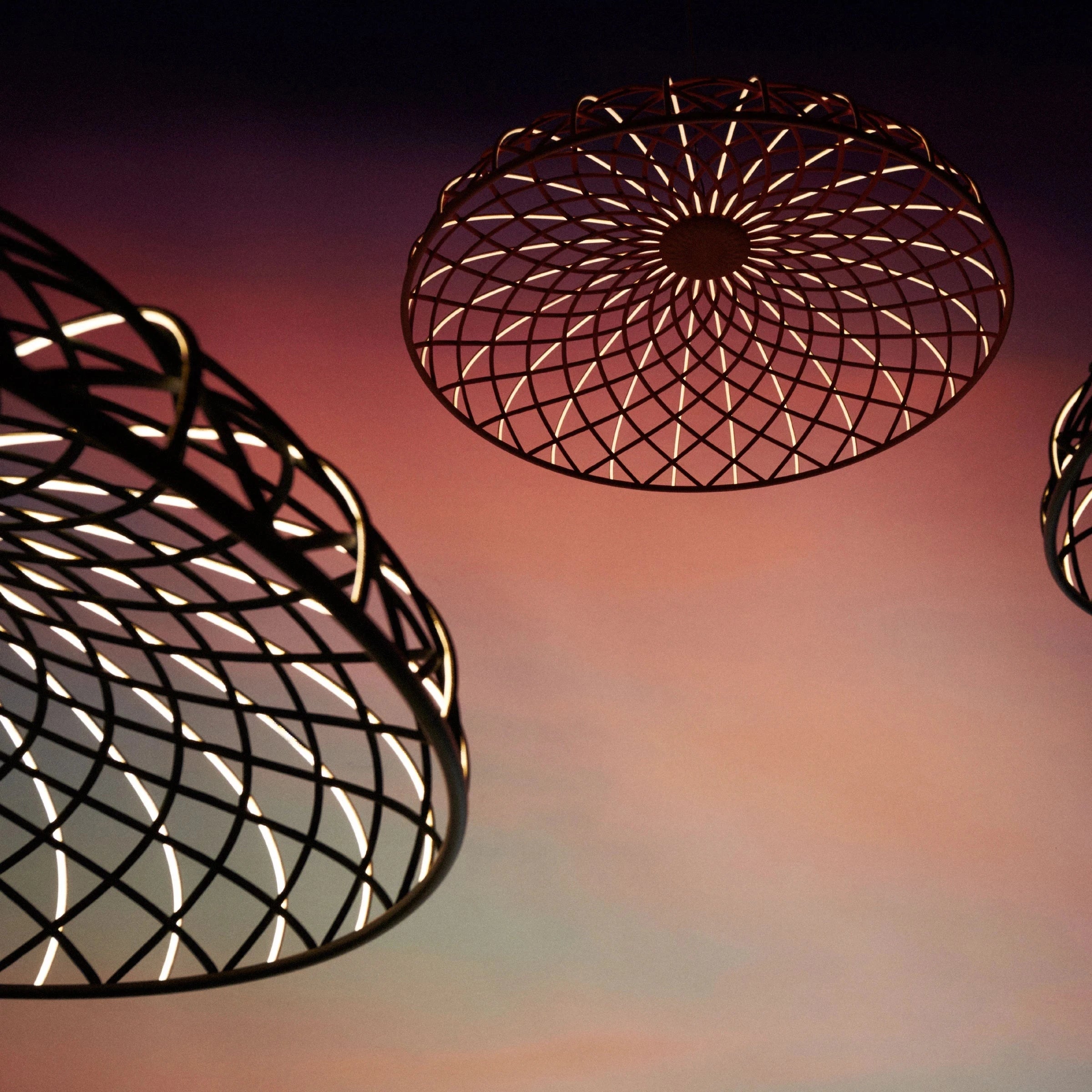 The appliance is fitted with a built-in balancing system at the top of the dome which helps adjust its balance, making it perfectly stable. The bottom of the dome is completed by an aluminium ring that keeps the domes entire network structure in place through a simple snap-fit system. The product is assembled with absolutely no glue so it can be fully separated to be recycled in the future and in case of any repairs or replacements. Available lamp finishes: Blue Tourmaline, Almond, Anthracite or Brick Red.Fitted with built-in electronics that allow for the use of different dimmer systems: 0-10V / 1-10V / DALI / PUSH."