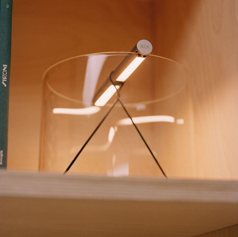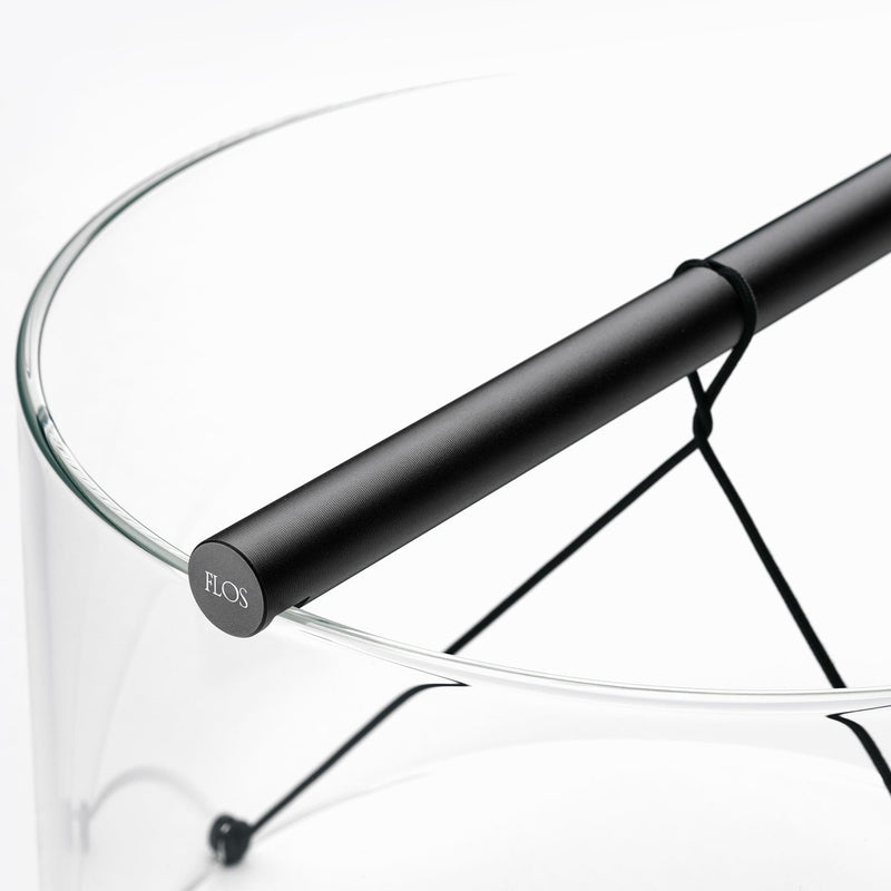 Clear glass cylindrical lamp body available in multiple sizes. The handle is made of aluminum and also acts as a light emitter. Multi-led diffuser in specially designed white polycarbonate to avoid the Multi Shadow effect and dazzle. High efficiency LED source with a lifetime of more than 50.000 hours. Electric cable of useful length 180 cm, covered in black fabric and equipped with dimmer switch for ON/OFF and adjustment of the light flow between 10-100%. Plug-in power supply with interchangeable plugs. To-Tie is a future-proof lamp as no glue is used to assemble its different parts. The product can therefore be separated, replaced individually, and recycled separately.