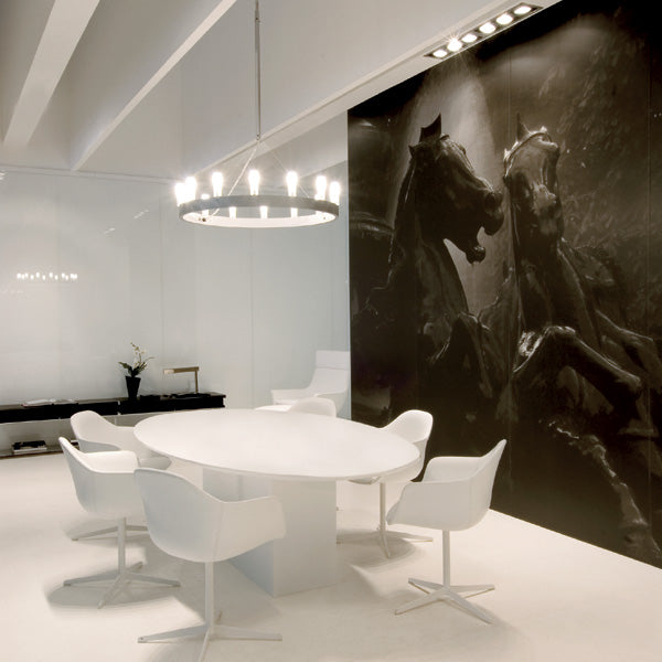 This spectacular lamp designed by David Chipperfield is inspired by those at the court of King Arthur. Available in two colours, in a single or double version with two concentric circles, it is a classy elegant lighting solution for any setting, even the most modern and minimal. New gold finishing, absence of tiges, 5 m length cables.