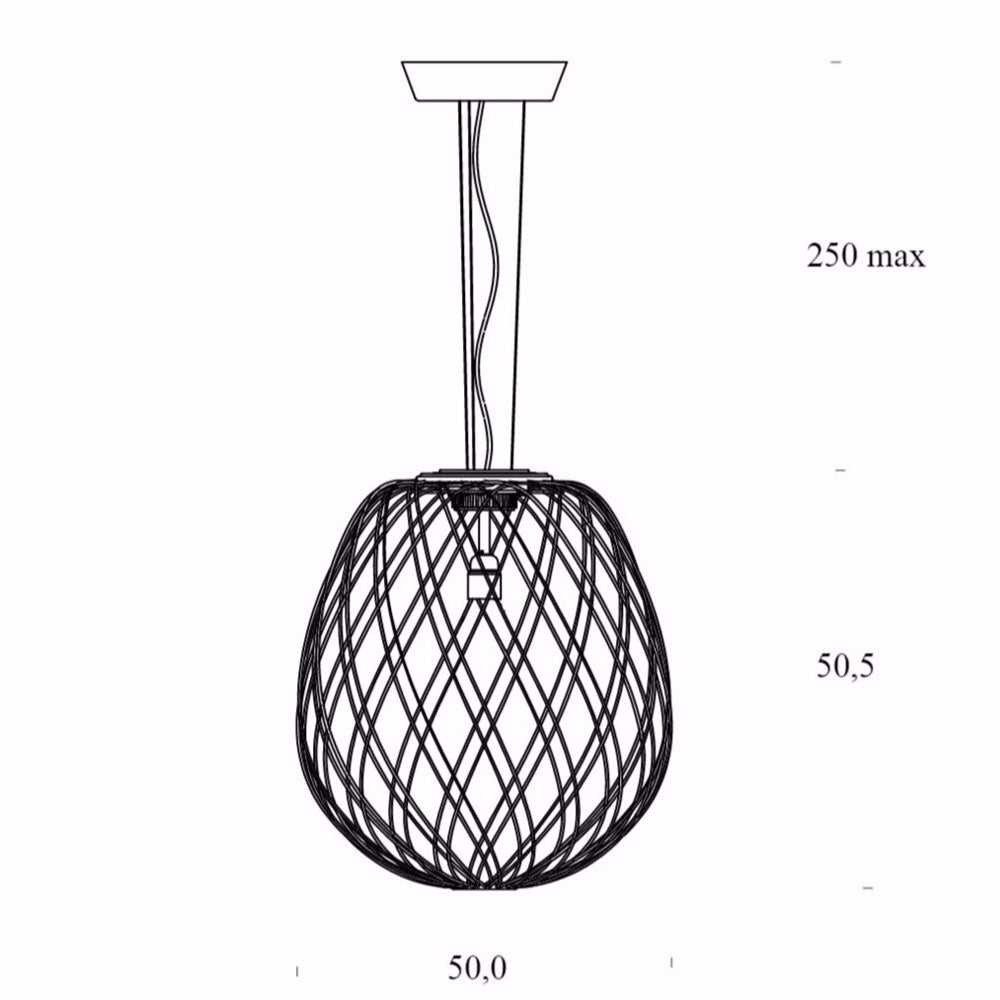 Suspension lamp with diffused and dimmable light. Transparent enclosed glass diffuser. Cage and base made of galvanized metal. Transparent power cable.