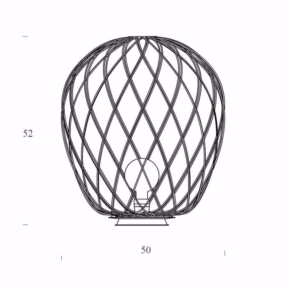 Table lamp with diffused and dimmable light. Transparent enclosed glass diffuser. Cage and base made of galvanized metal. Transparent power cable, dimmer and plug.