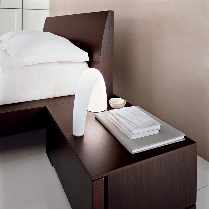 Table lamp with diffused light not dimmable. Diffuser made of opalyne blown glass with satin-finish. Transparent power cable, switch and plug. Bulb not included.