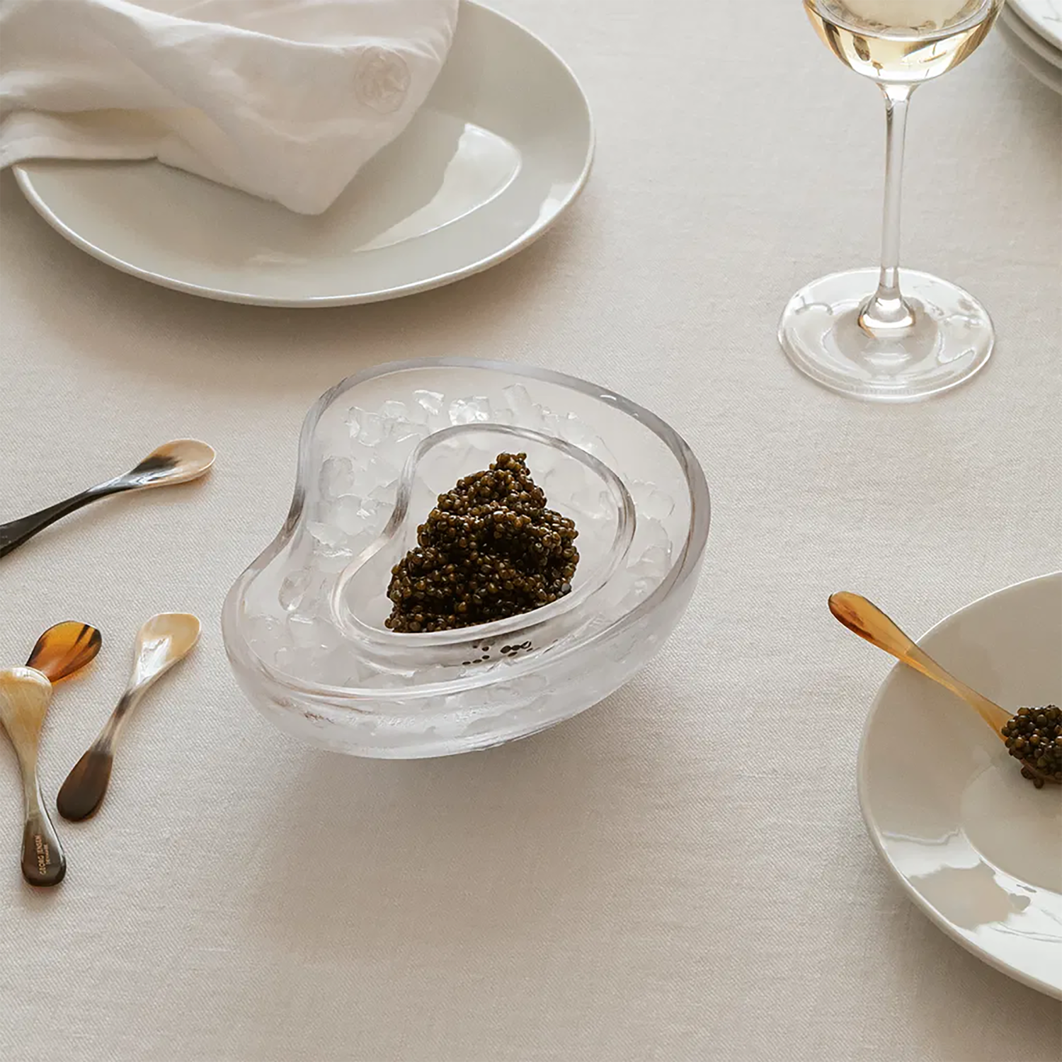 Best known for creating the coveted Bloom collection for Georg Jensen, Helle Damkjær brings her appreciation for soft, organic forms to this elegant caviar dish. Crafted from thick glass for a luxurious feel, the set includes two dishes: one to contain ice and the other for caviar. Perfect for elevating any setting, this design adds a touch of elegance wherever it is placed.
