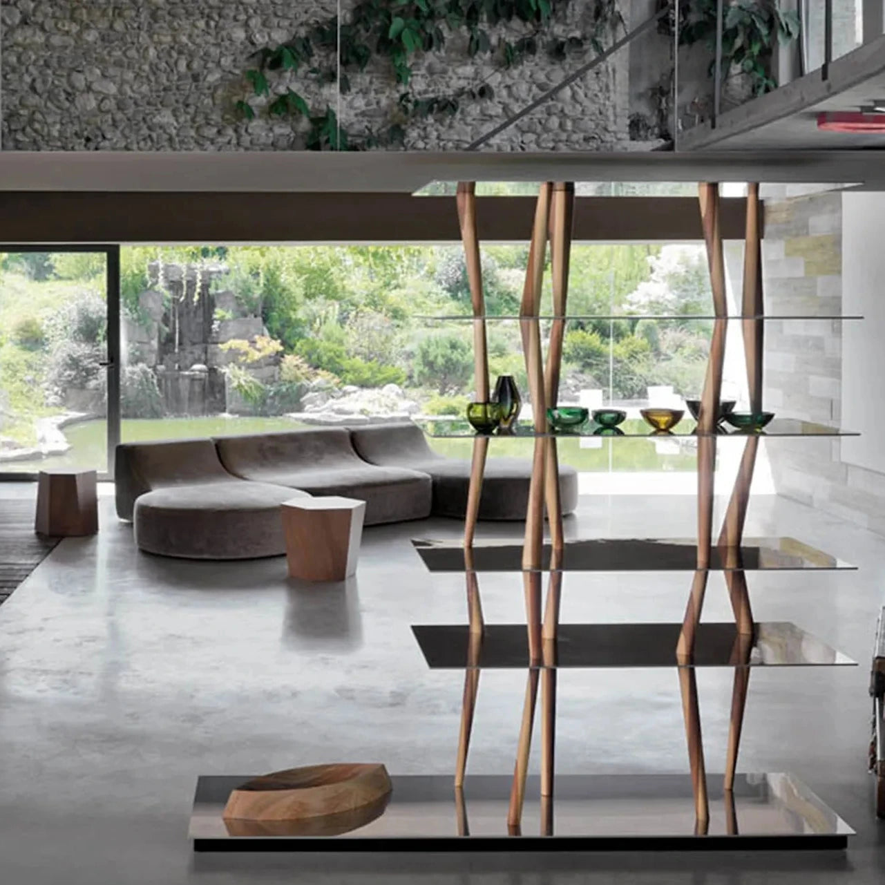 Movement and flexibility summarize the emotional power of Toyo Ito, who in this sculpture-bookcase captures the design essence of Sendai’s media centre (Japan), which he designed and used as inspiration. This leap in scale consists of six aluminium veneered shelves connected through turned elements of solid wood, all different from each other in inclination and section. Sendai is definitely a piece of furniture of silent albeit captivating design, which reflects the typical oriental philosophy of the great architect.