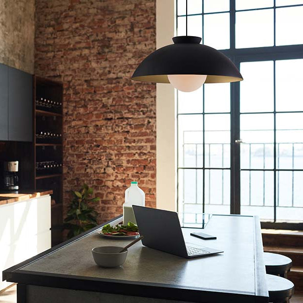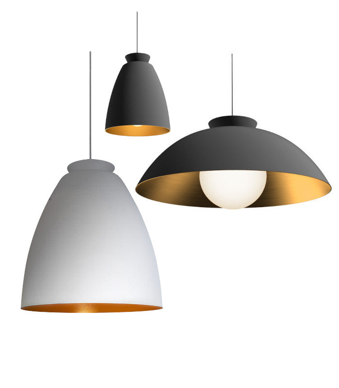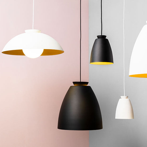 Each model is available in a choice of white interior, or in classic matt Black or White exterior with contrasting antique gold interior. Light also spills from the top to create a delicate illumination around the exterior. These simple forms create beautiful pendants that suit a wide variety of applications. The versatile range works perfectly as a cluster, particularly effective with multiple colour choices.