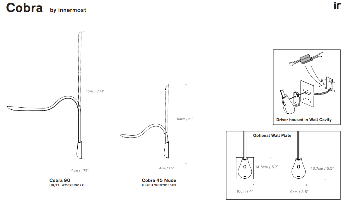 Cobra is a wall mounted LED task light with a fully adjustable, flexible stem. The light has a touch-activated switch and comes with a USB charging socket that supports the latest generation smart phones and tablets. The unit comes with a detachable optional backplate that can be removed for installation directly onto furniture and bedsteads.