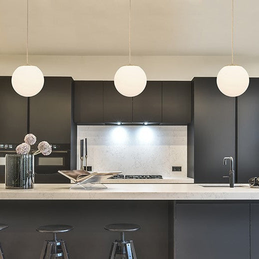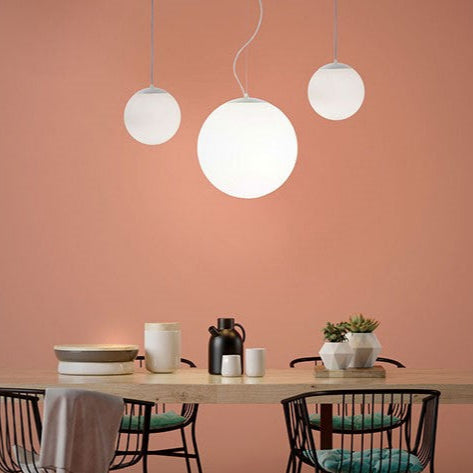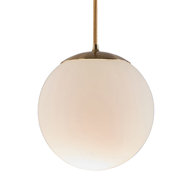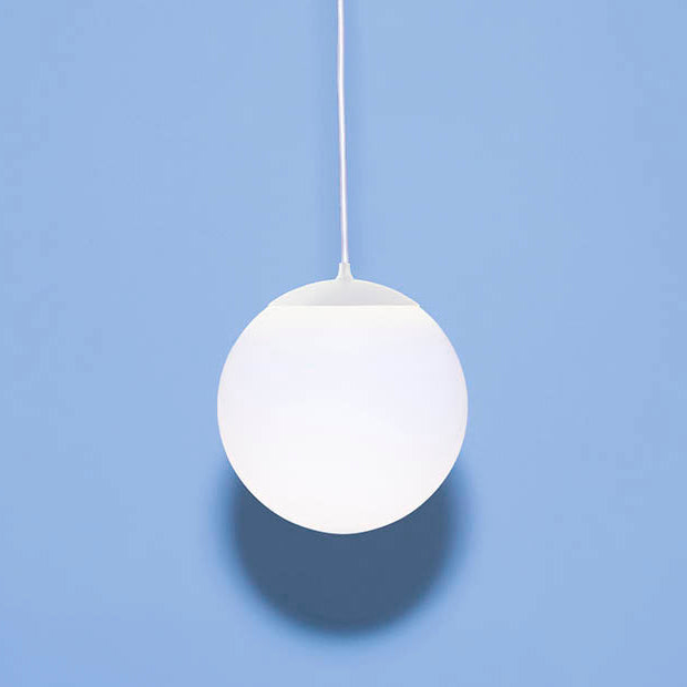 Drop is a frosted glass globe pendant delicately topped with a white powder coated or Brass plated Stainless Steel cap. Resembling a drop of pristine pearl, it is inspired by the flourishes of the mid-century. These perfect balls of light make a definite statement against any backdrop, particularly when suspended at multiple lengths. Drop is simplicity that can be used anywhere for the ultimate minimal lighting solution. Available in 2 size options.