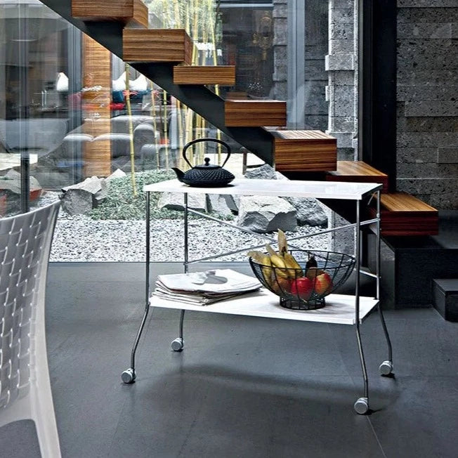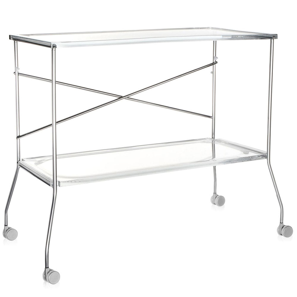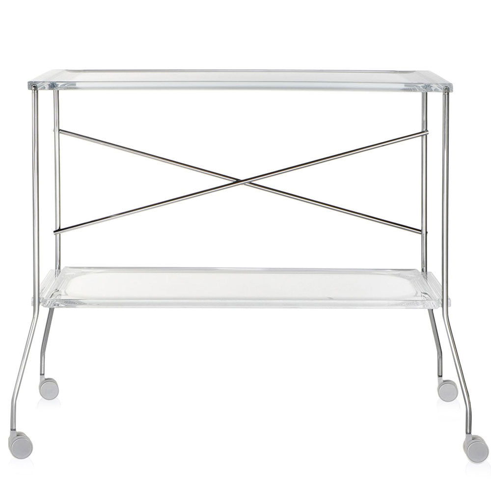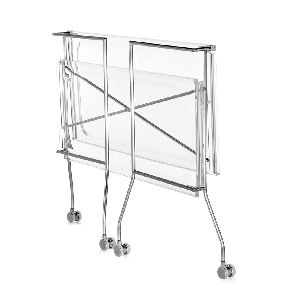 Kartell brings transparency to the world of trolleys too and thus we have Flip, the folding trolley which combines the transparent plastic surfaces of the trays with a metal frame.