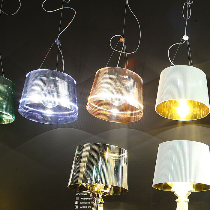 Gè is a suspension lamp attached to the ceiling with a decorated polycarbonate rosette suggestive of antique Venetian chandeliers. It comes with a 37 cm diameter pleated lampshade and is made entirely of polycarbonate. Gè is available in two versions. The first provides the effects of transparency and comes in soft, sophisticated colours. The second expresses the effects of white and black combined with gold and with the chrome version. The cable can be adjusted in height from 45 to 230 cm.