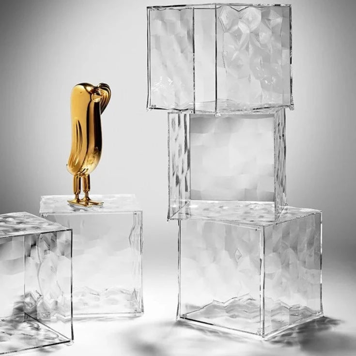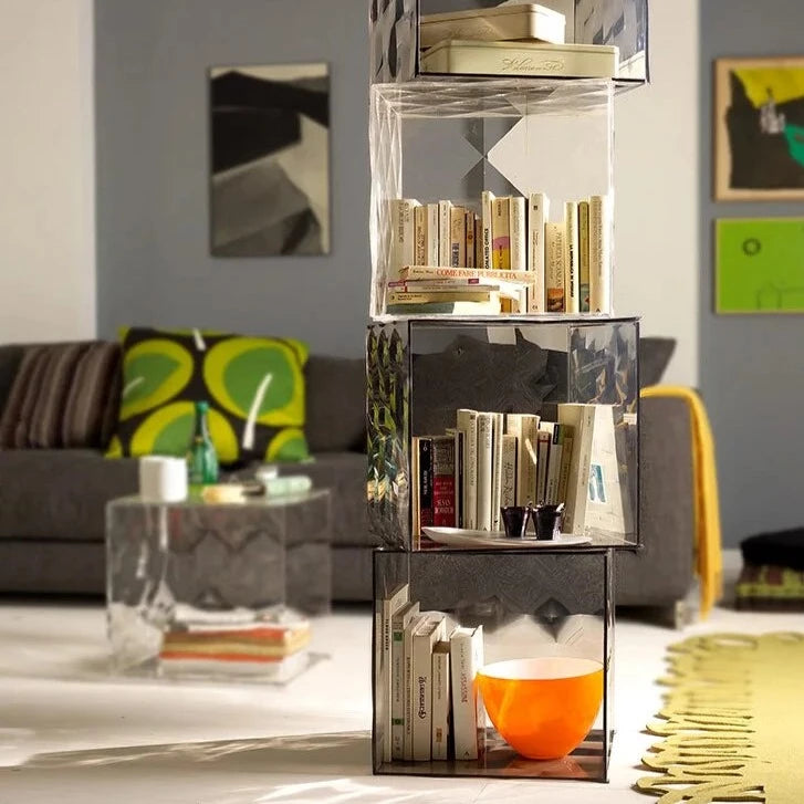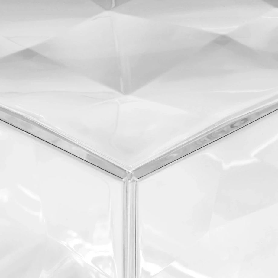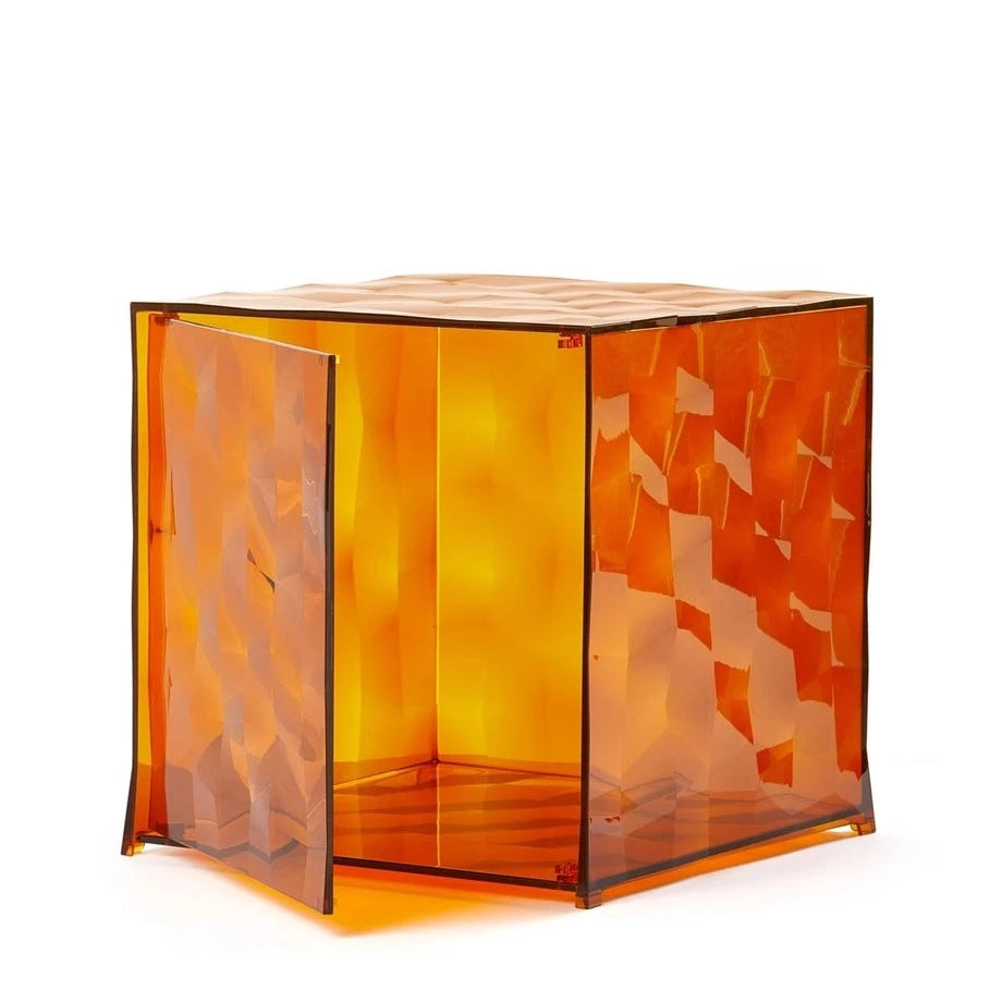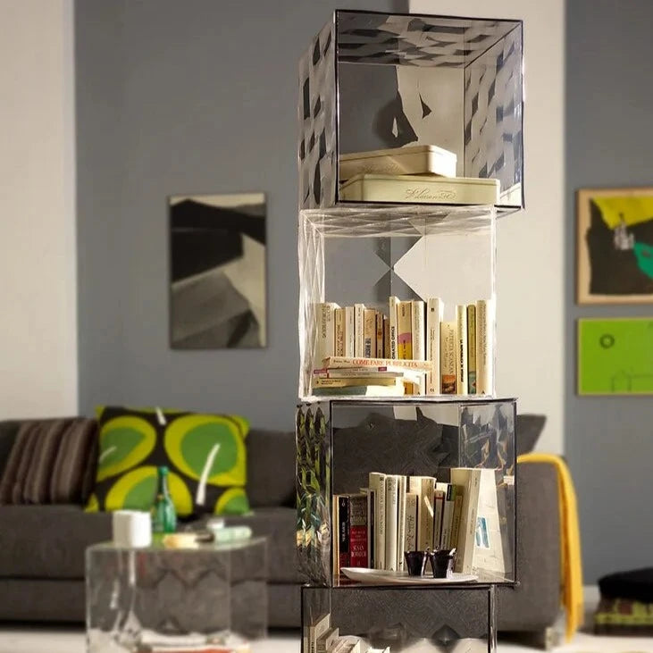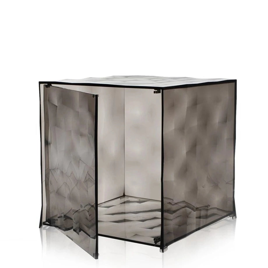 Optic is a container cube in PMMA which comes in two versions: closed with a door or with one open side. Its surface is strikingly decorated with square based pyramids, slightly in relief, which, whether transparent or mirrored, create a strong visual impact.