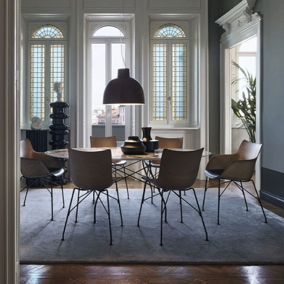 The P/Wood chair by Kartell was designed by Philippe Starck and belongs to the Smart Wood series of seating options. Soft lines, a filigree frame and a carefully shaped wooden seat shell characterise the chair, which finds its place at the dining table or desk. Philippe Starck and Kartell have created a series dedicated to the material wood. With the help of an innovative 3D technology, the seat shells of the Smart Wood seats are pressed into their shape. The bend brings out the true essence of the material..