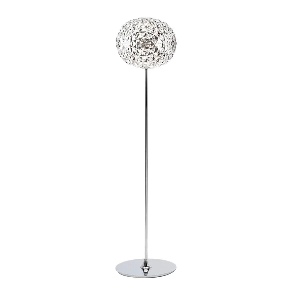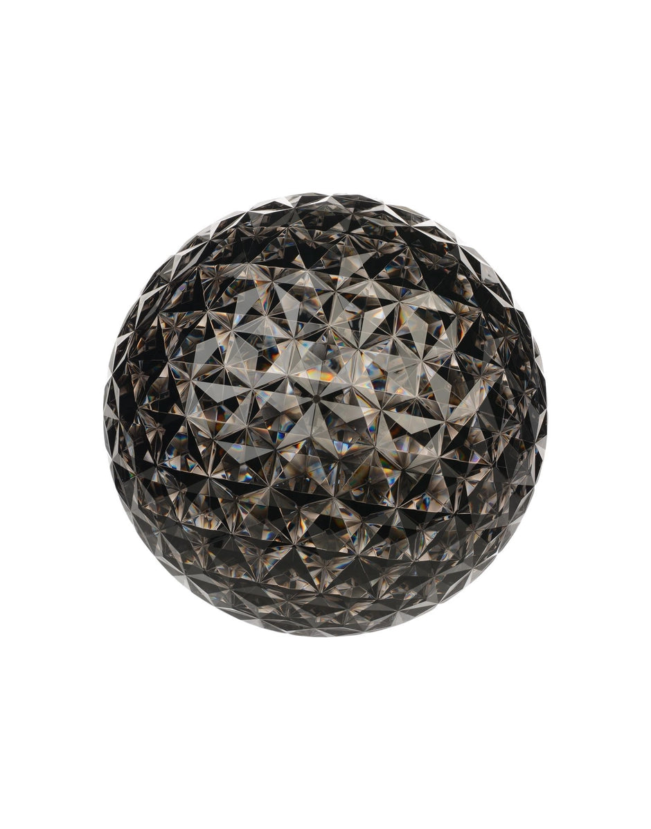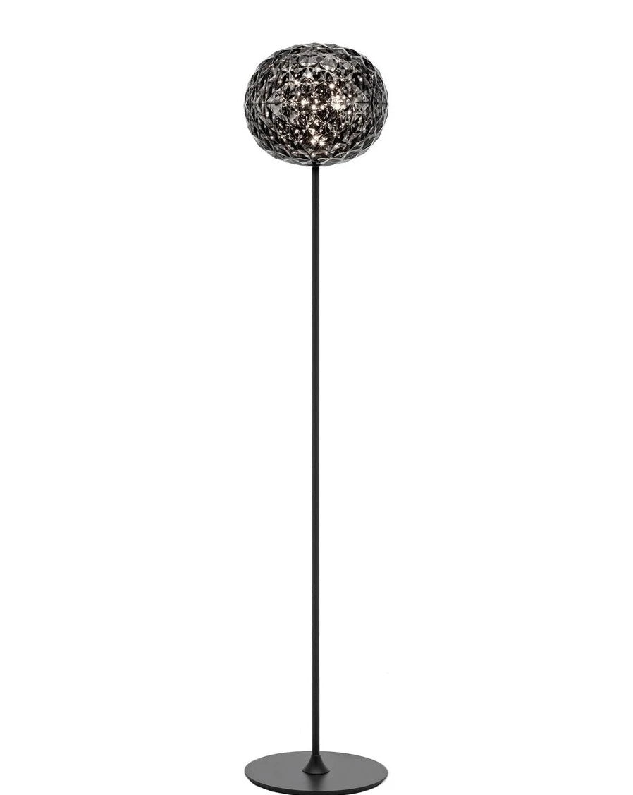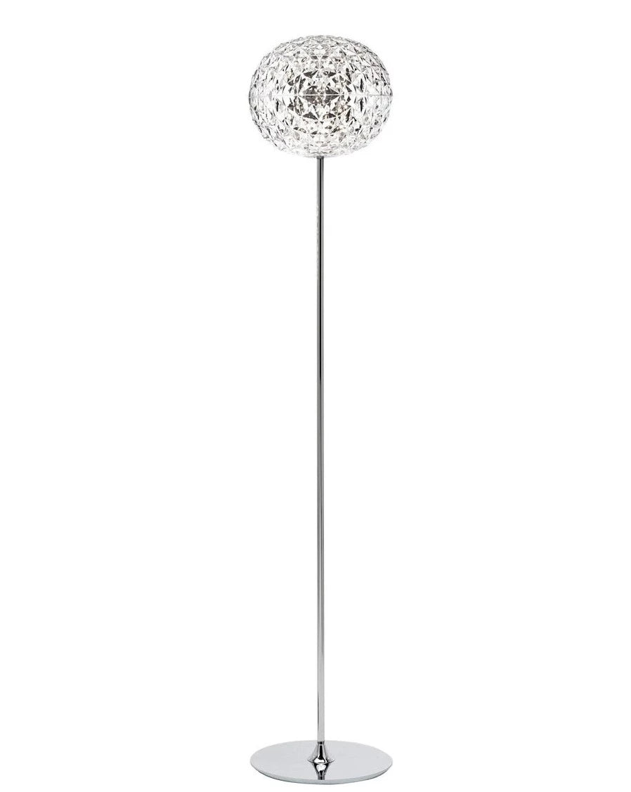 A family of lamps: suspended, for a coffee table and with a metal structure, and the most recent floor version of the lamp is available in two heights: 130 and 160 cm. The distinctive trait is the shape of the slightly elliptical transparent diffuser, which is characterised by a multi-faceted surface, both inside and out, which creates a rich tapestry of reflections.