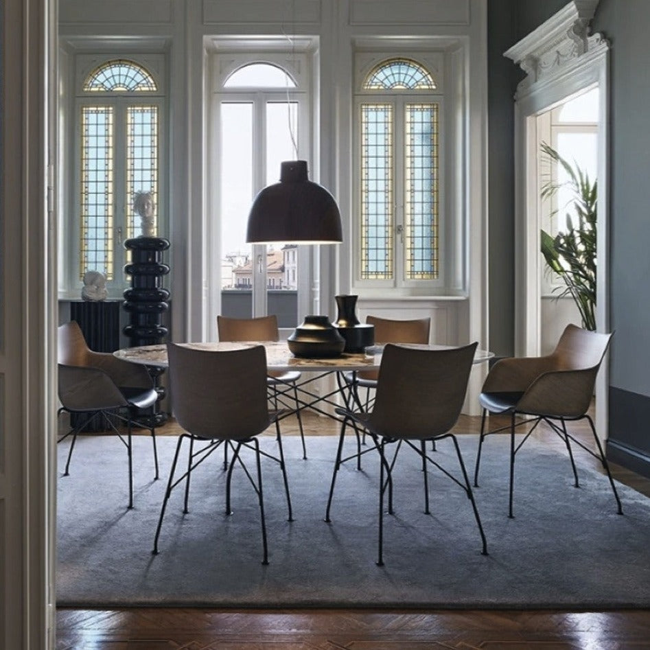 The Q/Wood armchair by Kartell is a timeless and elegant chair with armrests, which becomes an eye-catcher both alone and with several people at the dining table. The chair convinces with its soft curves and filigree legs. Q/Wood was designed by Philippe Starck as part of the Smart Wood series. The series includes seats with wooden seat shells, which are optimally bent with innovative 3D technology and thus adapt perfectly to the body.