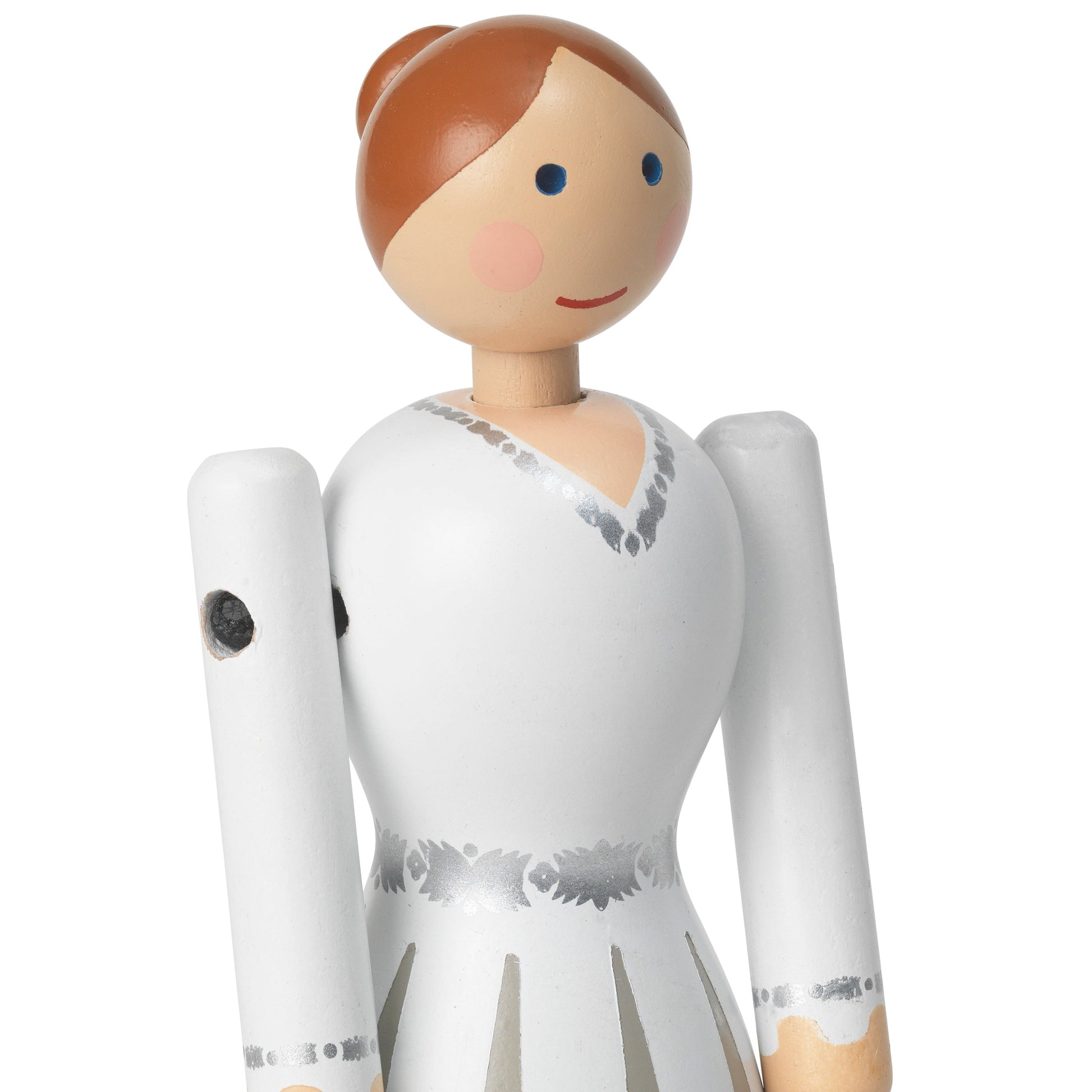 The lovely bride is wearing a floor-length, white gown with long sleeves and feminine silver details that include a tie around the waist and at the wrists, which are designed as a tribute to the ornaments Kay Bojesen created during his time as a silversmith. The hair is swept back in a simple hairstyle. Like Kay Bojesen’s original figurines, her cheeks are rosy and her smile is friendly and welcoming.