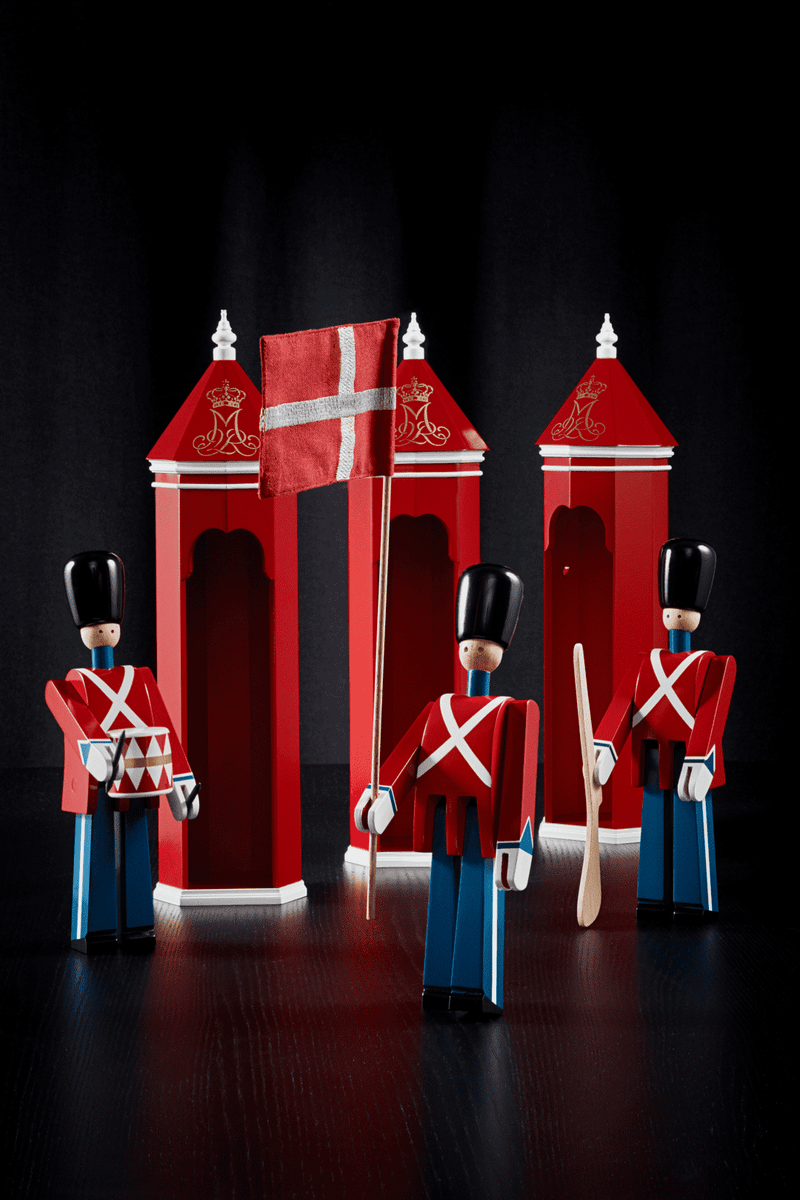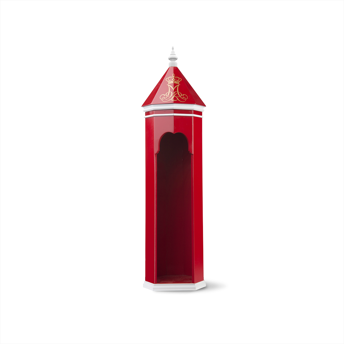 The Royal Danish Life Guards have guarded palaces and castles in Denmark since 1658, and Kay Bojesen designed his classic Royal Guardsmen in 1942. Now you can give your Royal Guardsman a place to shelter in this beautifully crafted sentry box, painted in the traditional red and white colours and embellished with the Royal Monogram in gold.