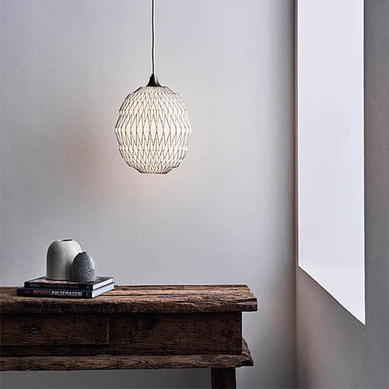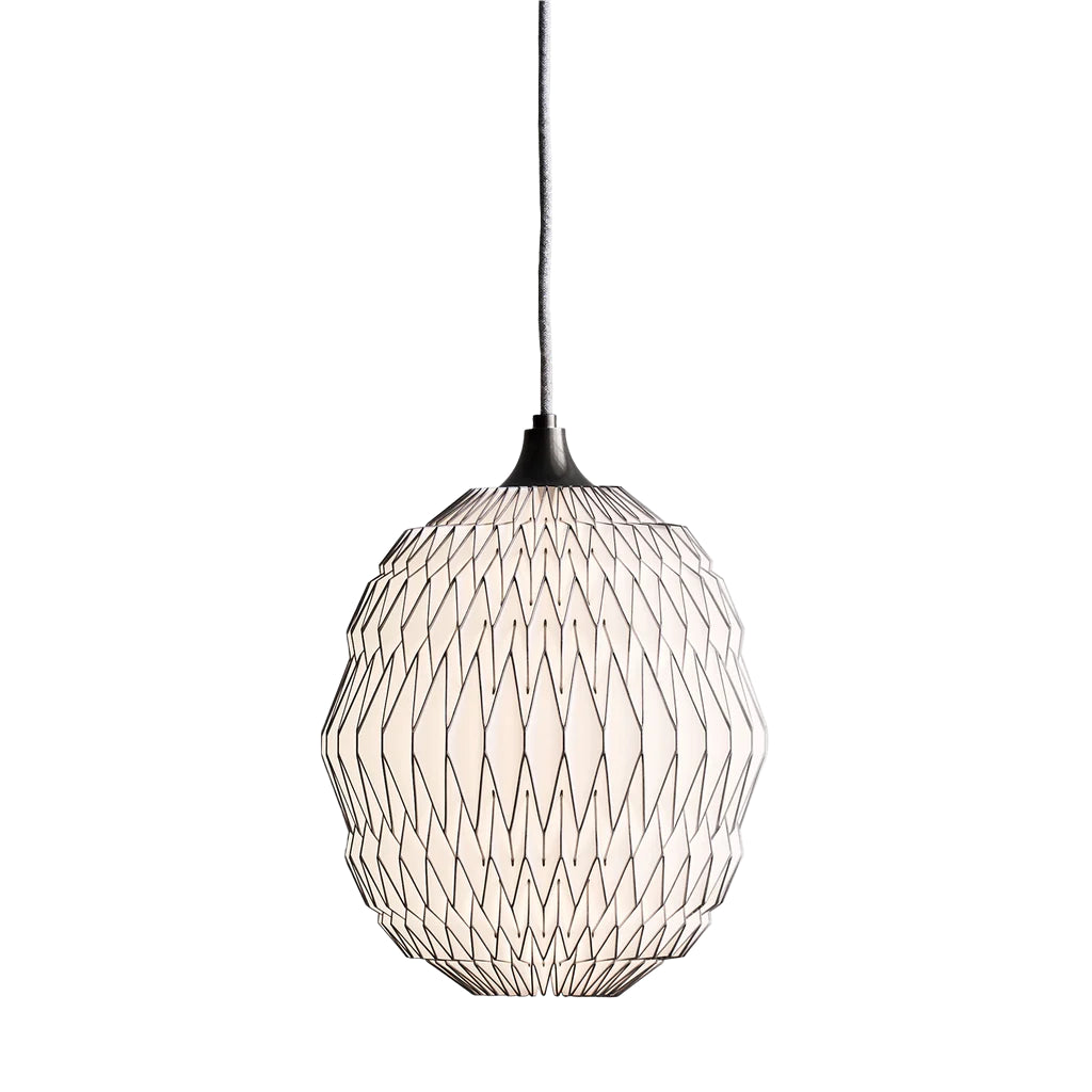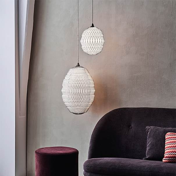 The original pattern and outlines have been carried forward, while the suspension and the direction of the pattern are more traditional in this lamp.