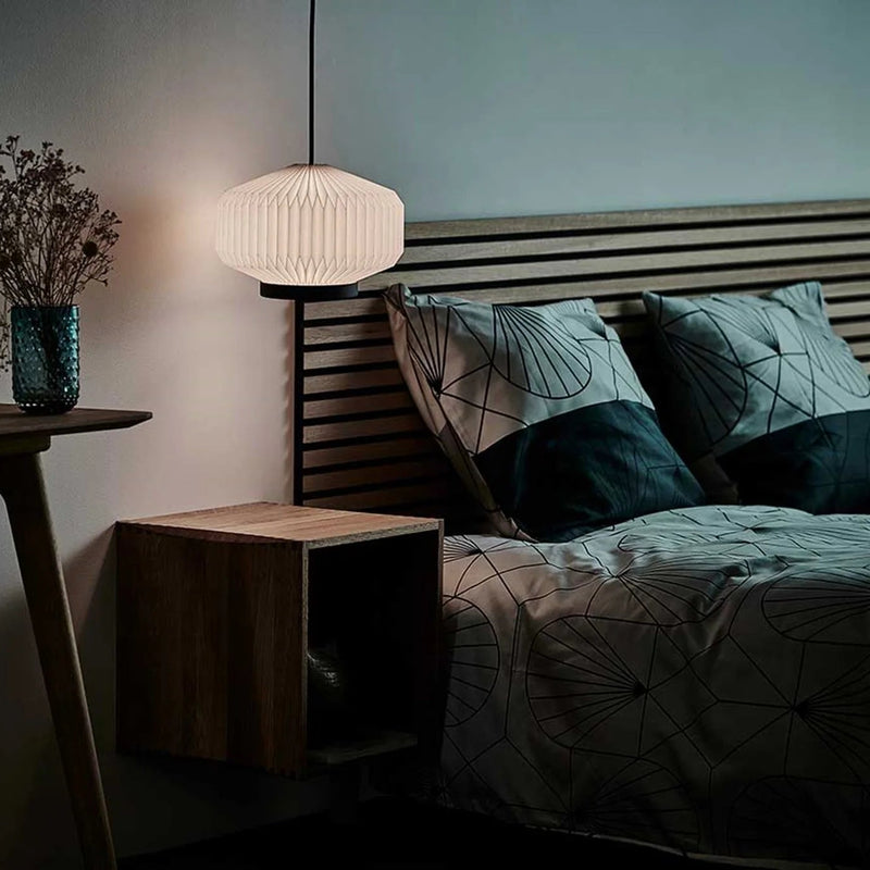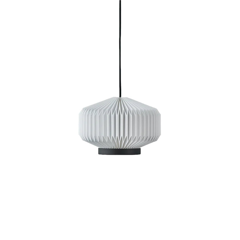 The Shibui pendant features a hand-folded shade and a black metal ring.
