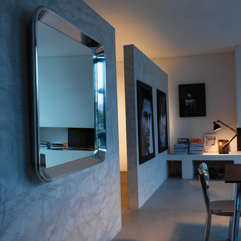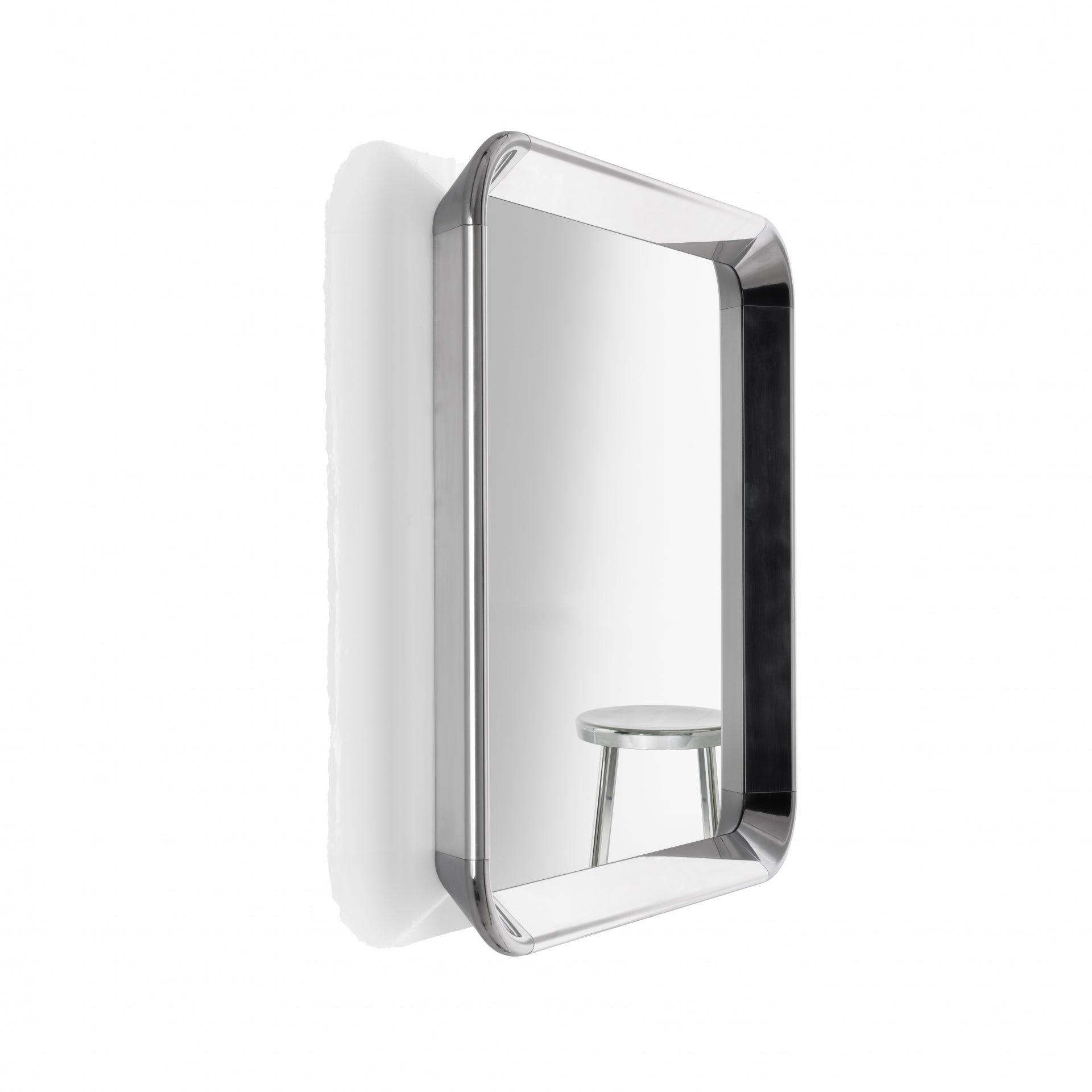 Frame in extruded polished. Joints in die-cast aluminium polished. Mirror with protective back film. Supplied with brackets for wall hanging in zinc plated steel.